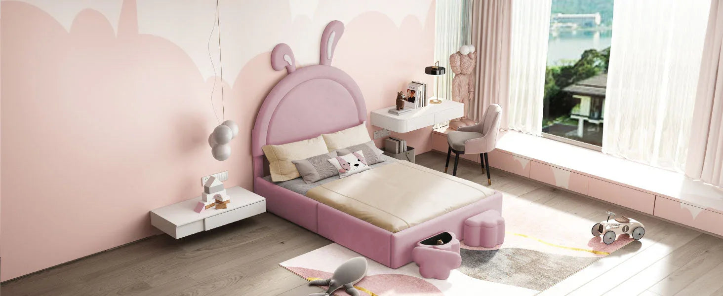 Rabbit Shaped Bed With Storage Stools Upholstered Pink