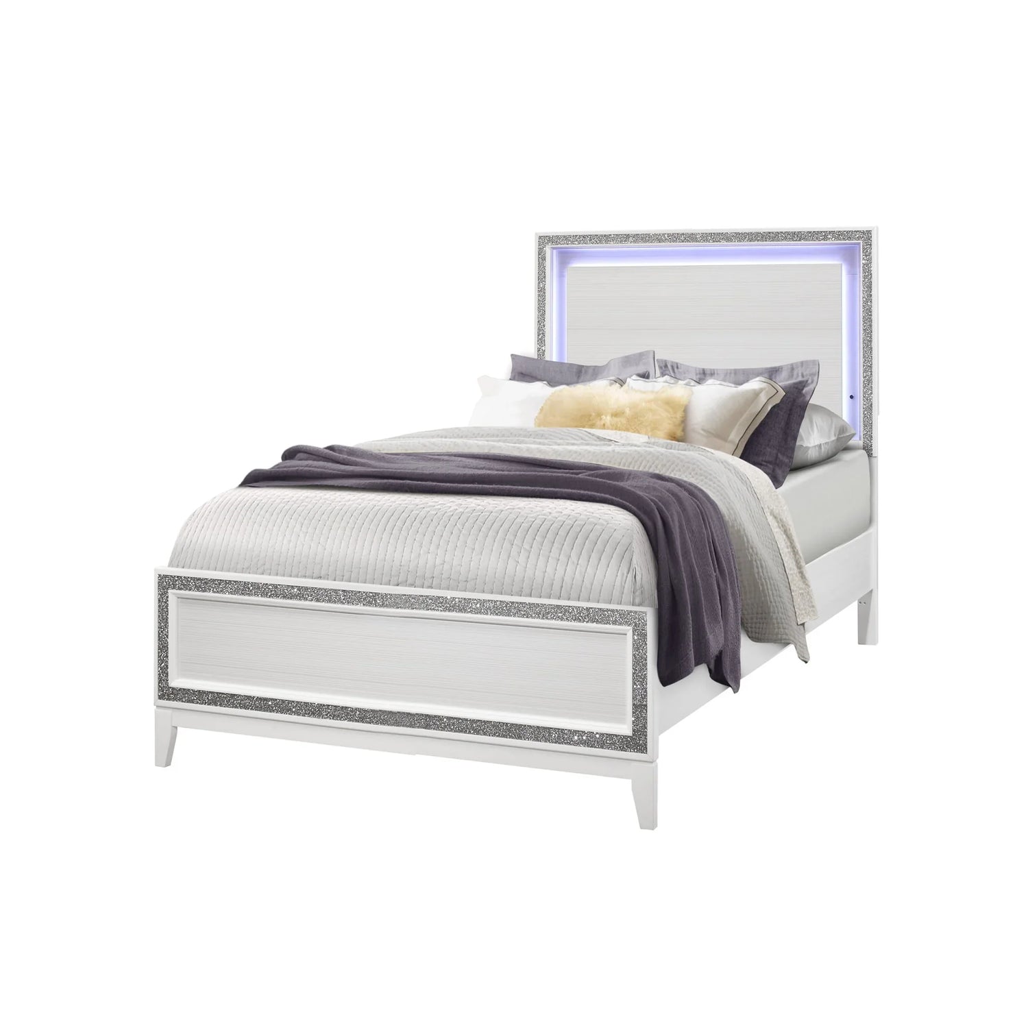 Day-to-day the Almera performs like a sturdy, ready-made centerpiece: engineered wood and rubberwood construction combine for lasting support, integrated headboard LED lighting offers soft ambient illumination with two touch-sensitive controls, and four center support legs plus multiple slats help keep your mattress stable night after night. The crushed crystal accent trim and bright white finish add a reflective, contemporary edge—note that natural lighting and screen settings may slightly change how the glitter and finish appear.