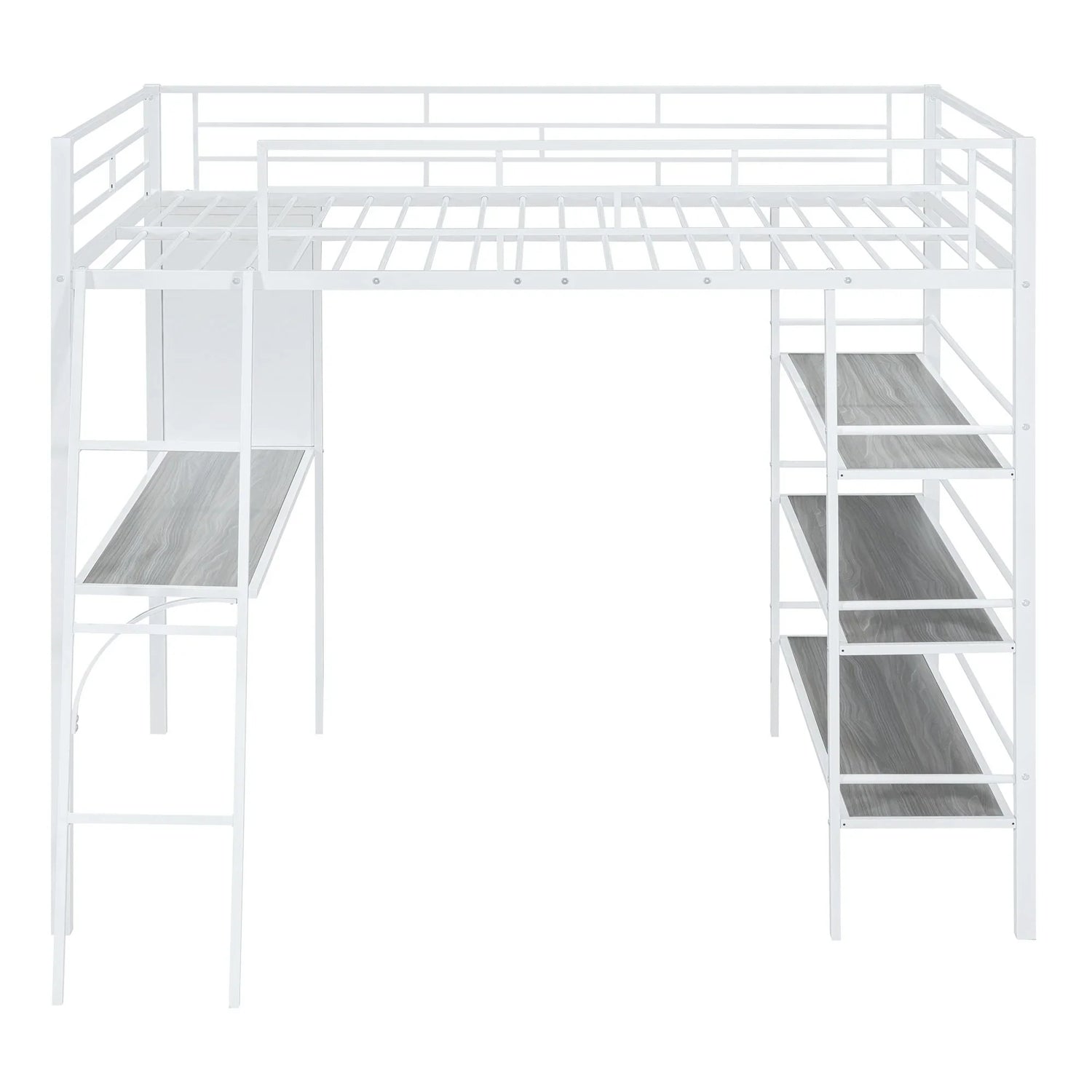 Crafted of metal in a clean painted finish, this loft bed features a sleek, modern design with slatted guardrails. The three open shelves provide ample space to organize and display your essentials. Equipped with a spacious desk and a board underneath, this bed creates a comfortable and functional space for work, reading, and relaxation. A beautiful and practical addition to any bedroom.