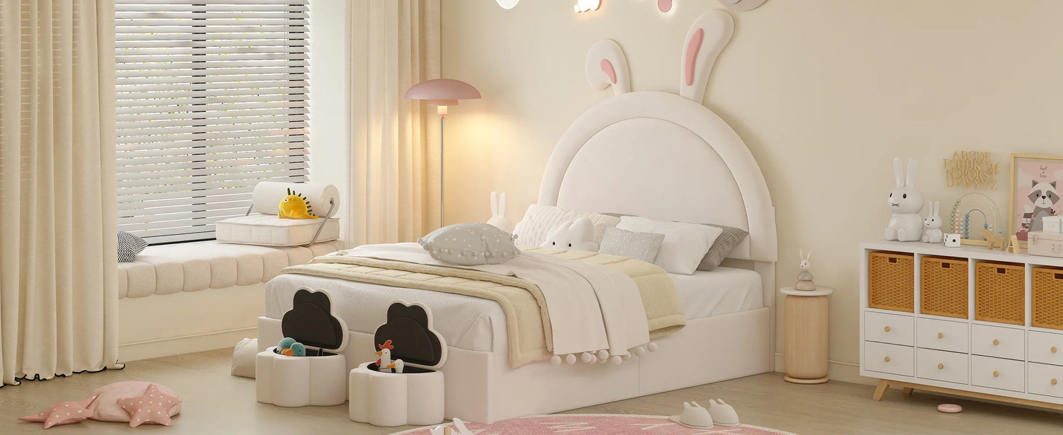Bring joy and charm to your child's bedroom with this adorable rabbit-shaped bed, designed to captivate and delight. Covered in soft velvet fabric, this bed offers a cozy, warm touch while adding a playful and imaginative element to the room. Built with durable MDF and plywood, it ensures long-lasting use and is perfect for accompanying your child through the years. The unique storage footstools, shaped like rabbit paws, enhance the bed’s whimsical appeal and provide convenient space for toys or books, making it an ideal choice for a child's cozy and fun-filled bedroom.