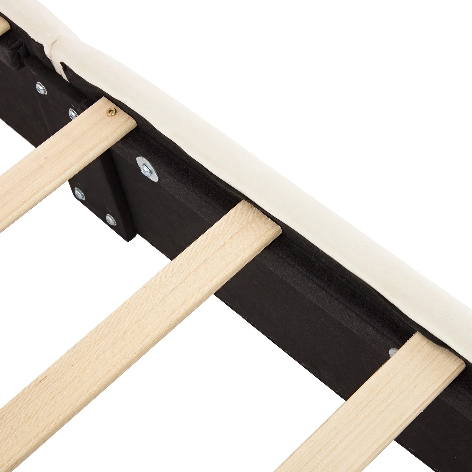 • Bring a touch of whimsy to your child’s bedroom with this adorable upholstered bed, featuring a bunny ear-shaped headboard that adds charm and playfulness to any decor. Crafted from high-quality MDF and plywood with 10 sturdy bed slats, this bed supports up to 300 lbs, ensuring durability for long-lasting use. The bed’s soft velvet upholstery provides a cozy and warm feel, perfect for creating a welcoming atmosphere. Two storage stools at the foot of the bed offer practical space for toys, books, and more, giving children a cute and functional spot to sit and play. Sized at 78.3 x 57.1 x 56.3 inches, this bed is easy to assemble with a manual included, requiring no box spring.