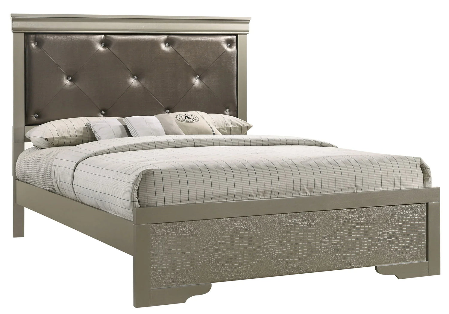 Designed for anyone who wants a polished bedroom look without leaning too formal, this transitional bed pairs a jewel‑tufted upholstered headboard with a sculpted, textured footboard to add subtle glamour to a range of interiors — from modern‑classic master bedrooms to elevated teen rooms. The low‑profile rails and substantial headboard create a comfortable backrest for reading or streaming, while the textured finish on the footboard gives the piece an on‑trend, tactile focal point.