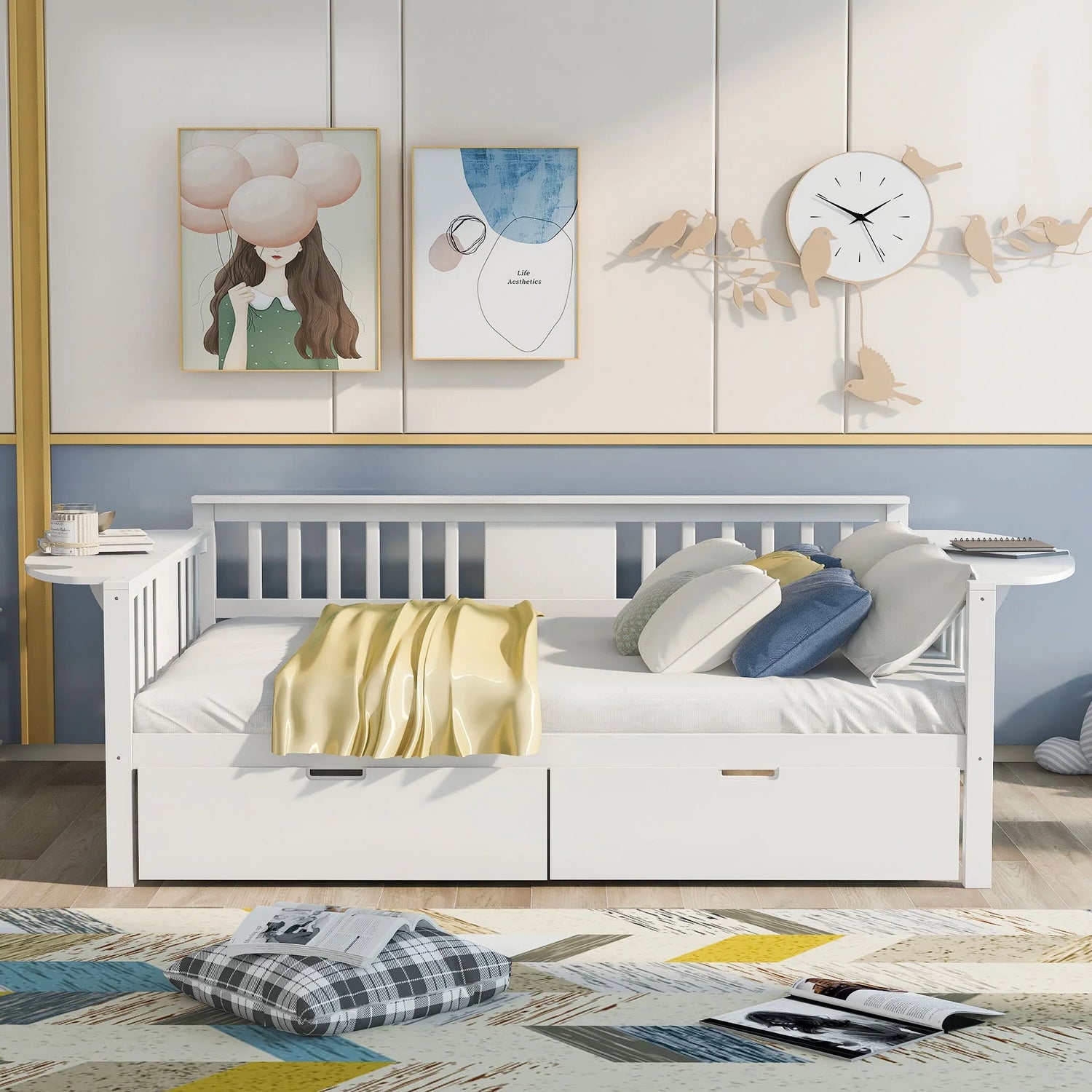 Multi-functional Design: The daybed frame with rails on three sides can serve as a bed in your bedroom, or as a sofa or seat in your living room. With small, foldable tables on the left and right, you can conveniently place a cup of coffee or a book within reach. It perfectly meets your different needs.