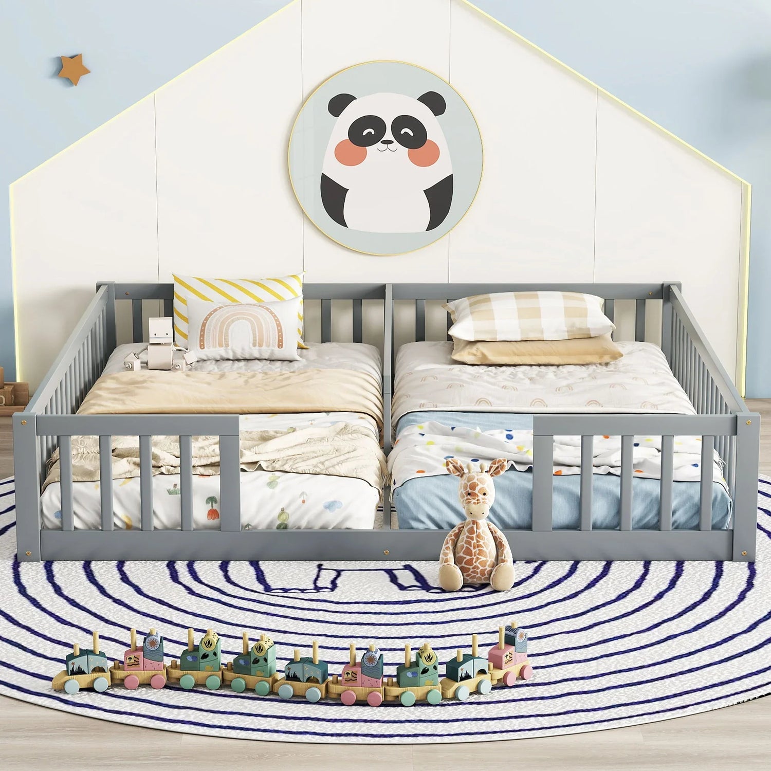 Double Twin Floor Bed With Fence, Guardrails, Without Door - Gray