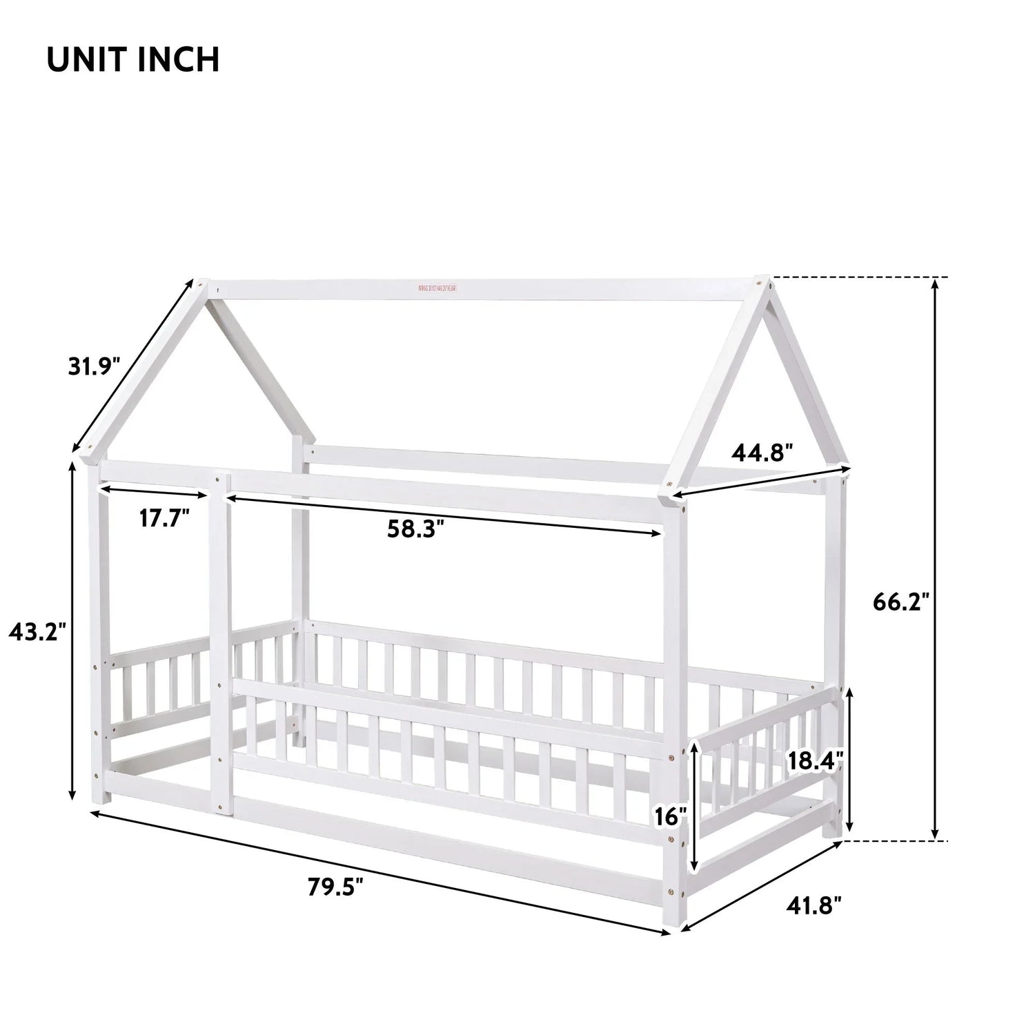 Twin Size Floor Wooden Bed With House Roof Frame, Fence Guardrails - White