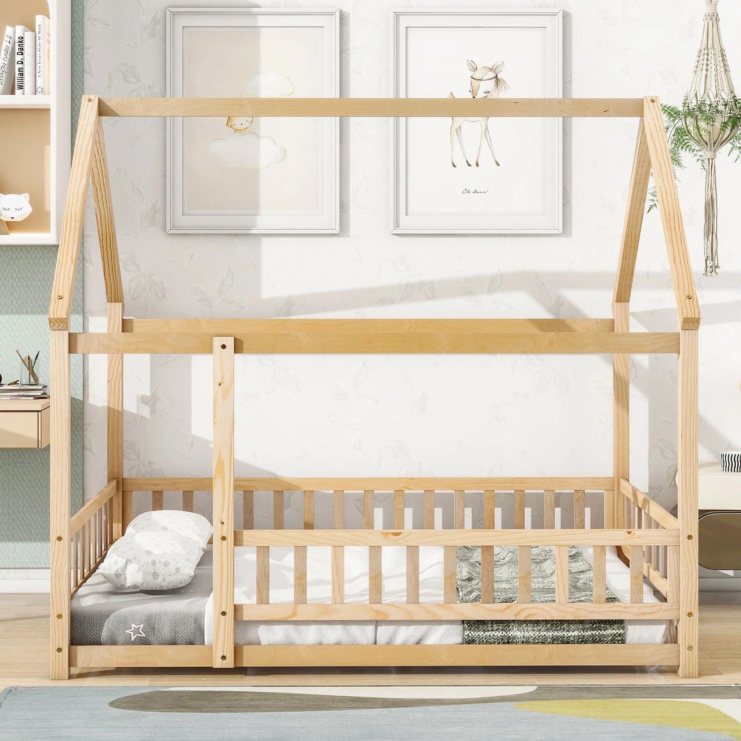 Full Size Floor Wooden Bed With House Roof Frame, Fence Guardrails - Nartural