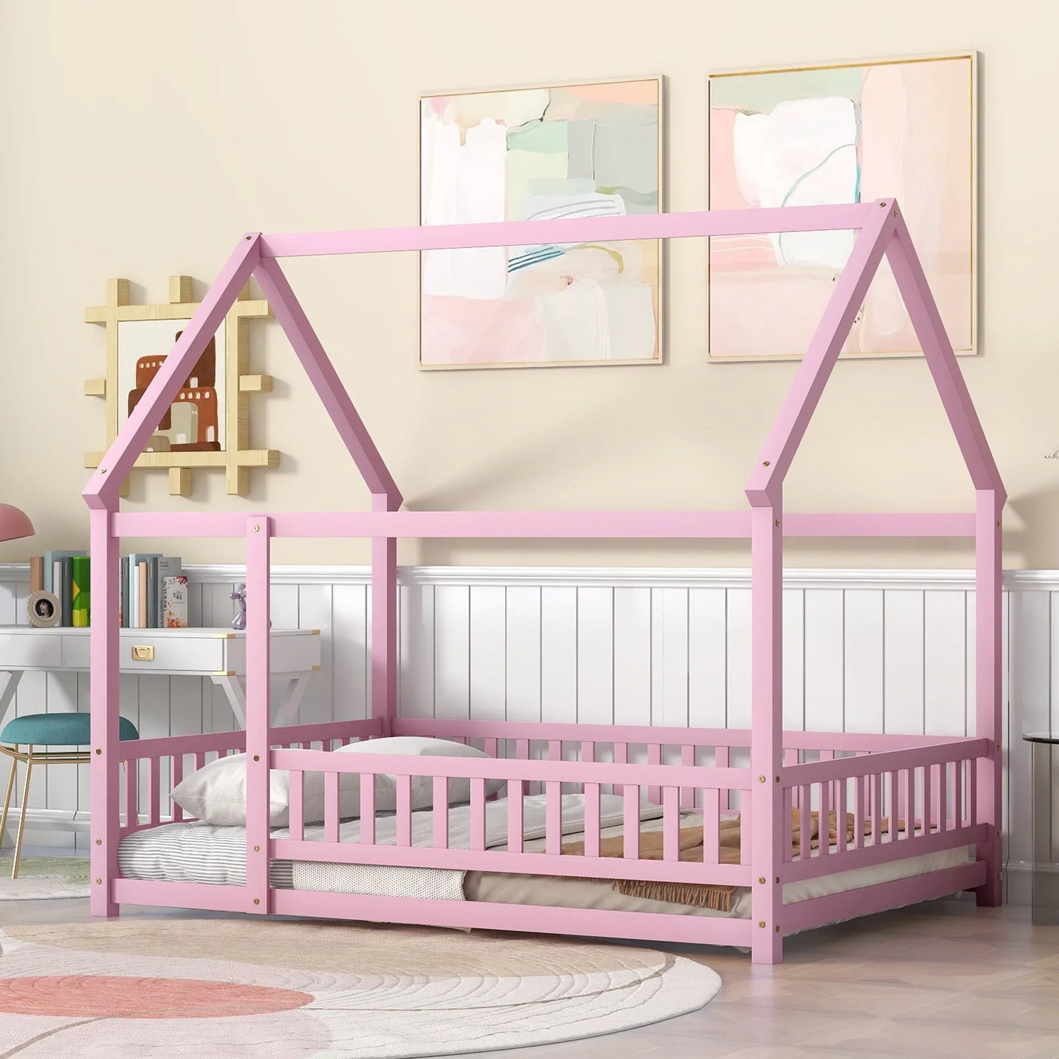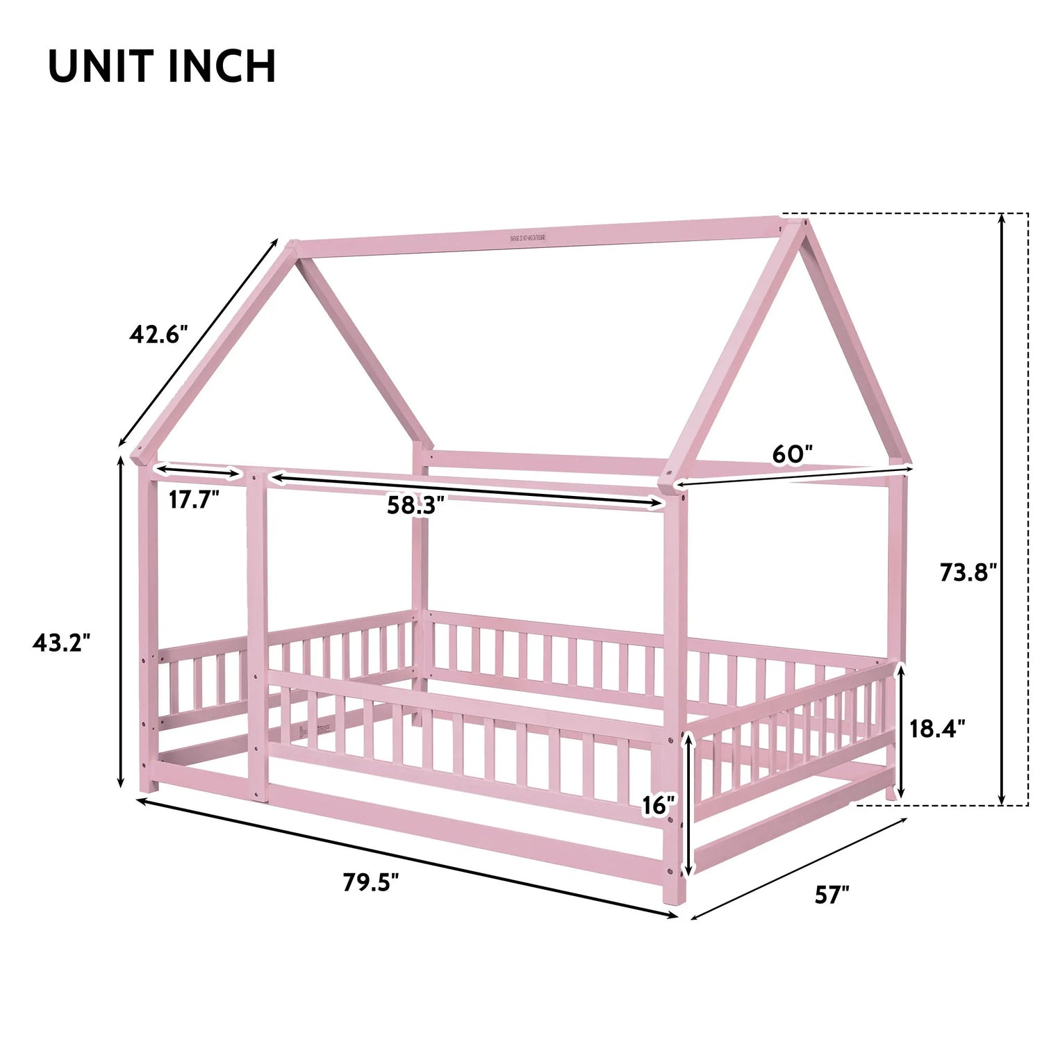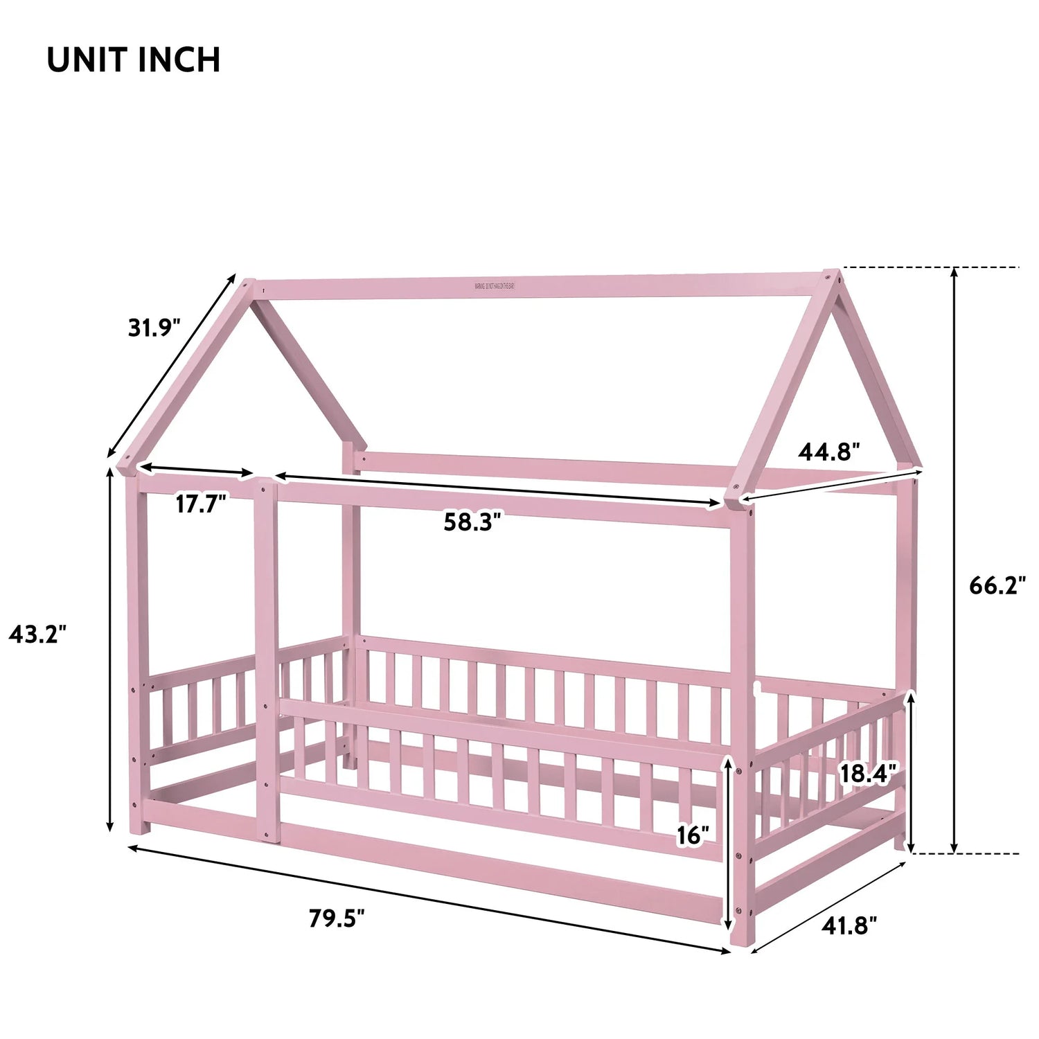 Full Size Floor Wooden Bed With House Roof Frame, Fence Guardrails - Pink