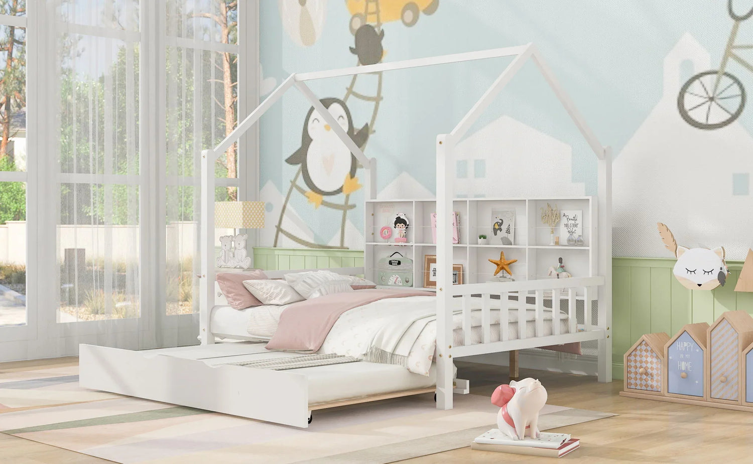 Full Size House Bed With Trundle, Kids Bed With Shelf - White