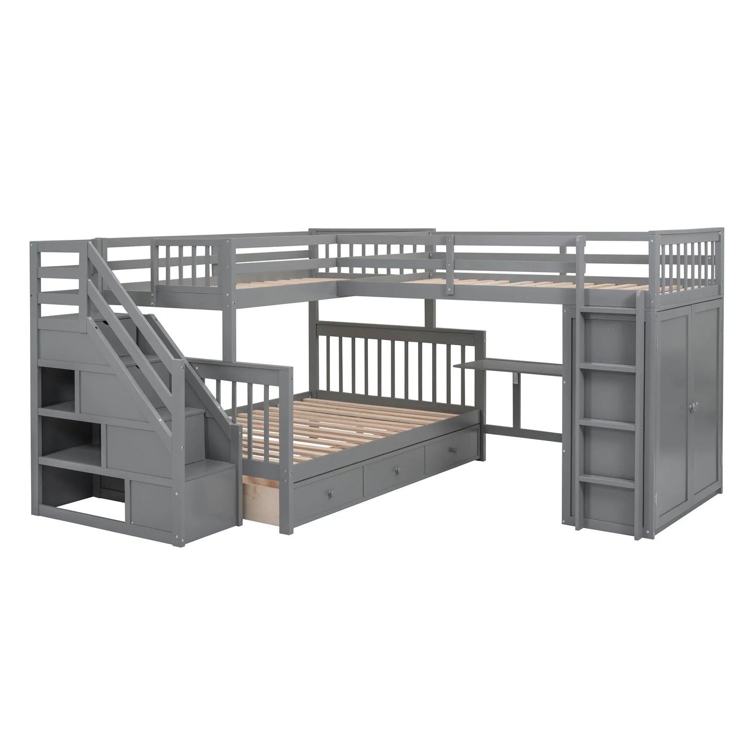 Twin Twin Over Full L Shaped Bunk Bed With 3 Drawers, Portable Desk And Wardrobe - Gray