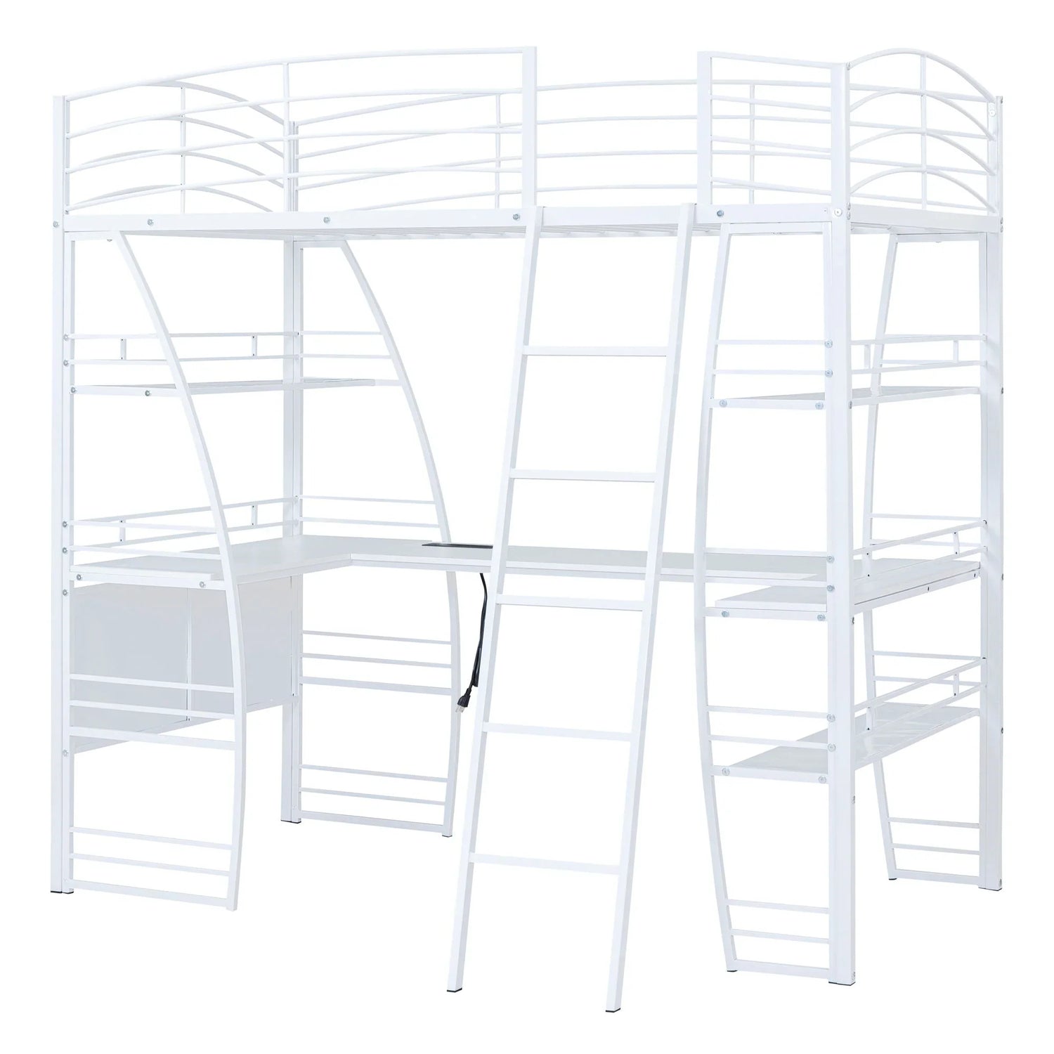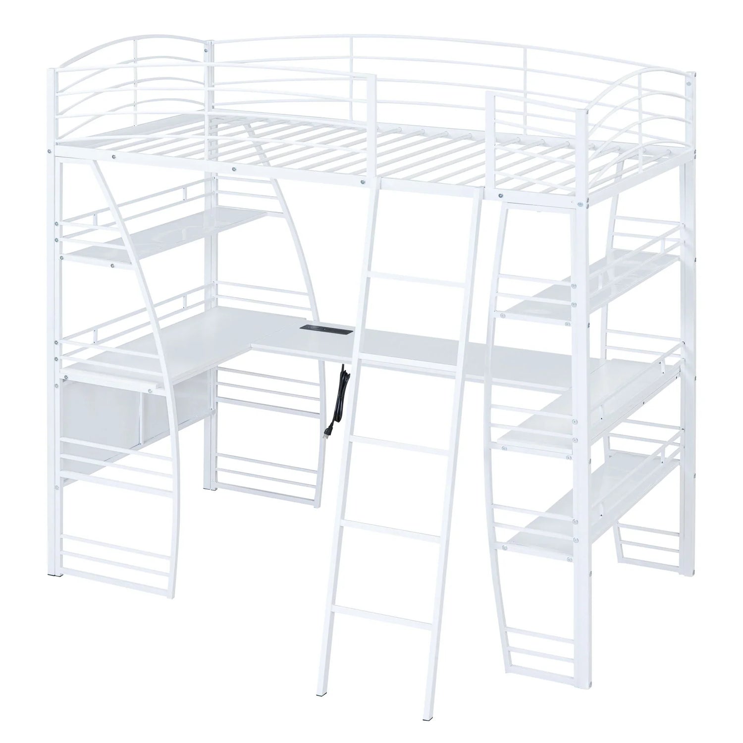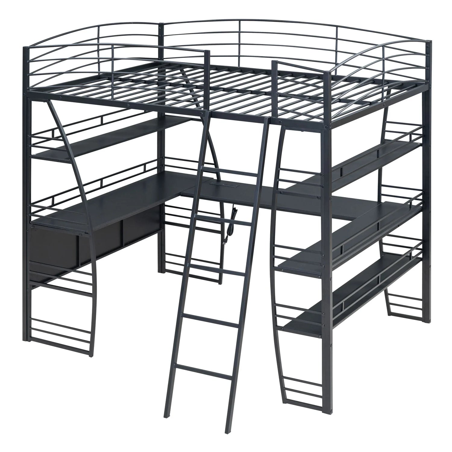 Crafted from metal with a clean painted finish, this metal loft bed strikes a clean-lined silhouette with curved slatted guardrails. This bold and imaginative design easily captures attention and complements your room decor. The four-layer open shelves offer ample space to display whatever you want, including lamps, books, and toys. For your convenience, a set of sockets, USB ports, and wireless charging is equipped on the desk, saving you the hassle of charging your phone and tablet while you work or read. Equipped with a large L-shaped desk, this bed provides a comfortable place to work, read, and enjoy yourself. I am sure that this imaginative loft bed can create your little wonderful world.