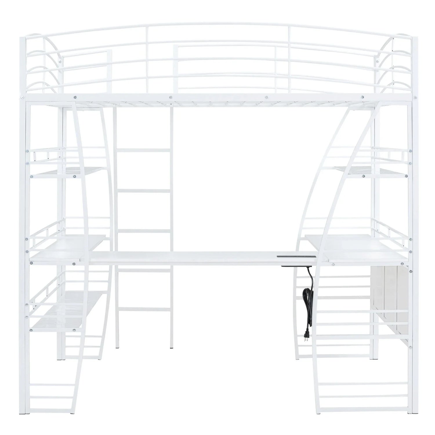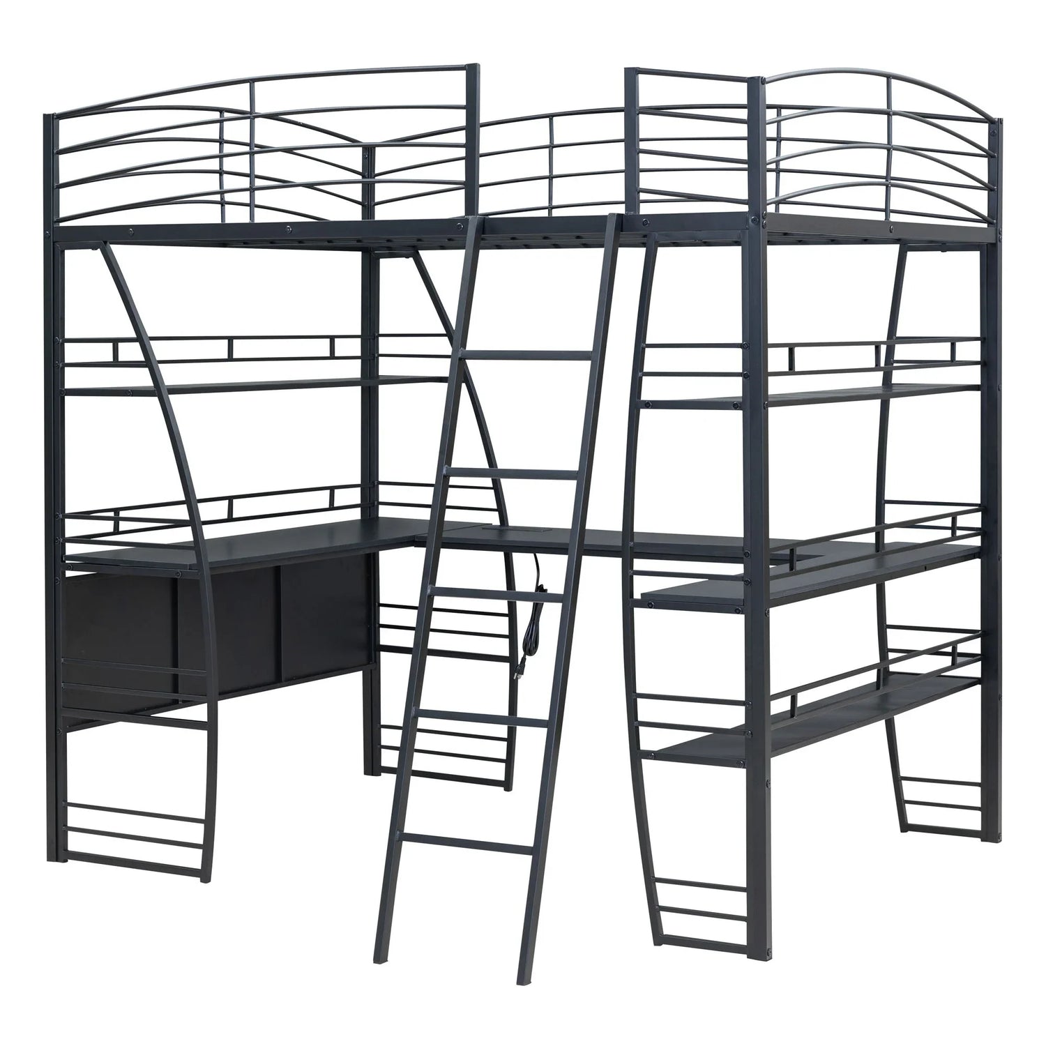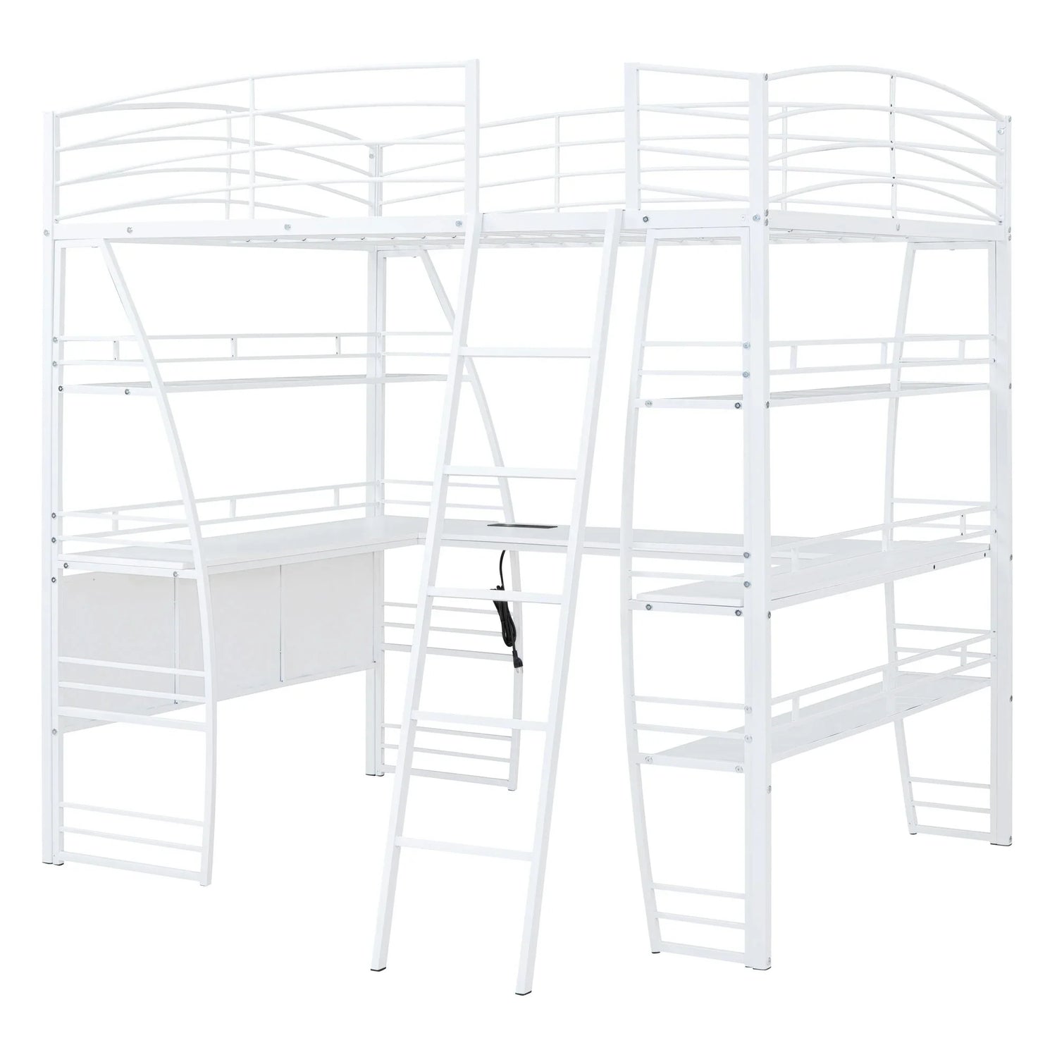 Crafted from metal with a clean painted finish, this metal loft bed strikes a clean-lined silhouette with curved slatted guardrails. This bold and imaginative design easily captures attention and complements your room decor. The four-layer open shelves offer ample space to display whatever you want, including lamps, books, and toys. For your convenience, a set of sockets, USB ports, and wireless charging is equipped on the desk, saving you the hassle of charging your phone and tablet while you work or read. Equipped with a large L-shaped desk, this bed provides a comfortable place to work, read, and enjoy yourself. I am sure that this imaginative loft bed can create your little wonderful world.