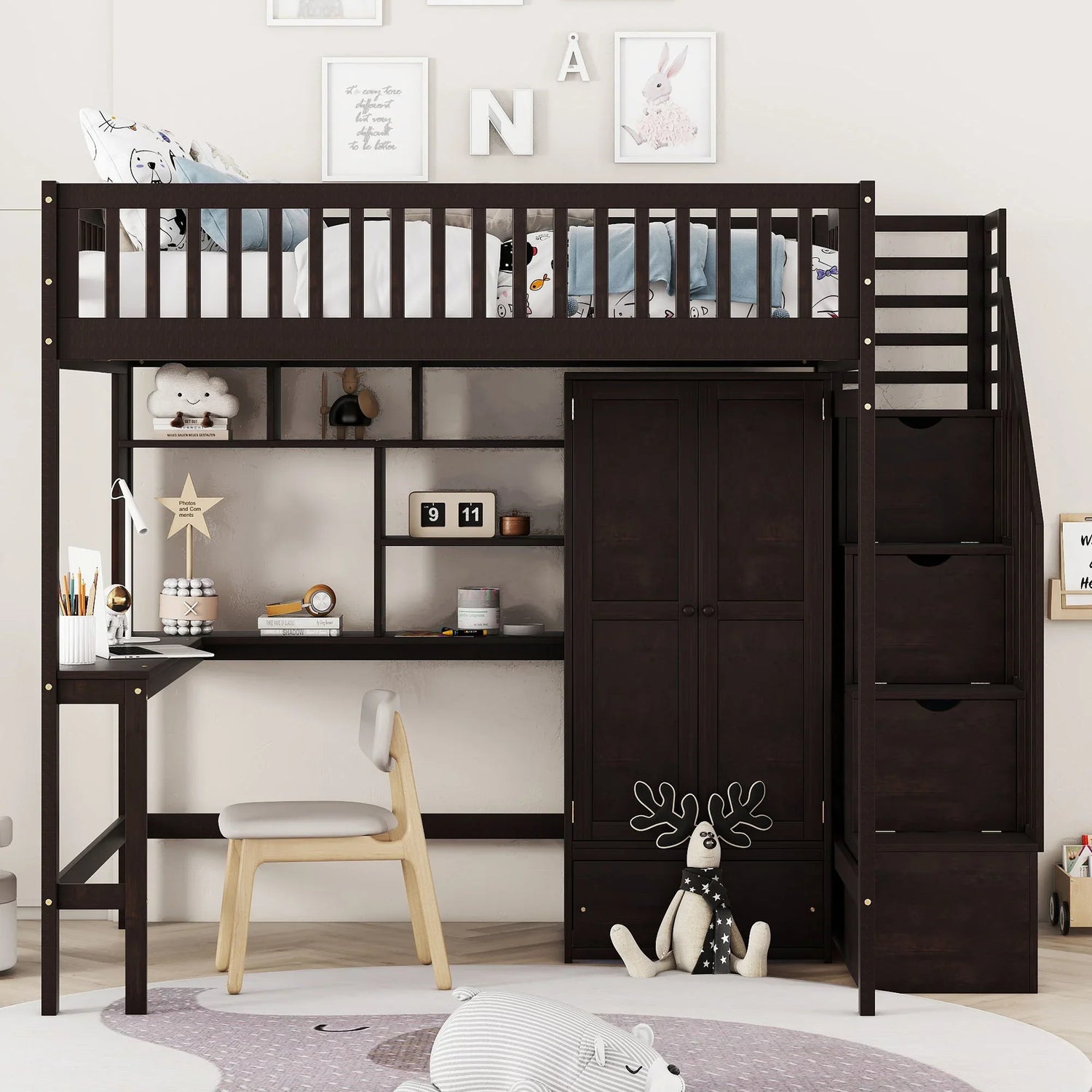 Full Size Loft Bed With Bookshelf, Drawers, Desk, And Wardrobe - Espresso