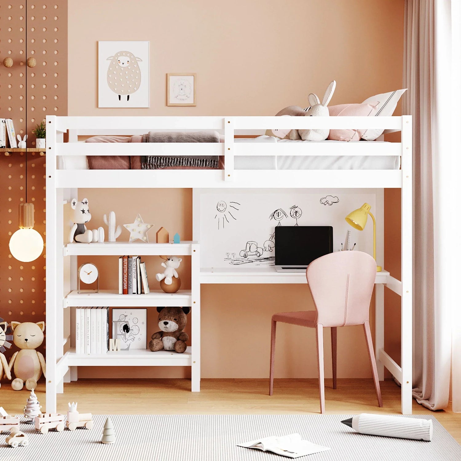 Twin Size Loft Bed With Shelves, Desk And Writing Board - White