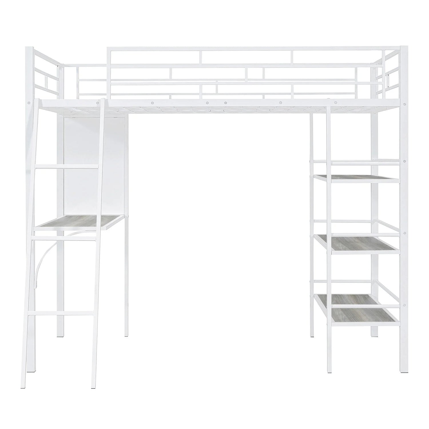 Crafted of metal in a clean painted finish, this metal loft bed strikes a clean-lined silhouette with slatted guardrails. The 3-layer open shelves offer ample space to display whatever you want. Equipped with a large desk and board underneath, this bed provides a comfortable place to work, read, and enjoy yourself. This loft bed will be a beautiful and practical piece in your bedroom.
