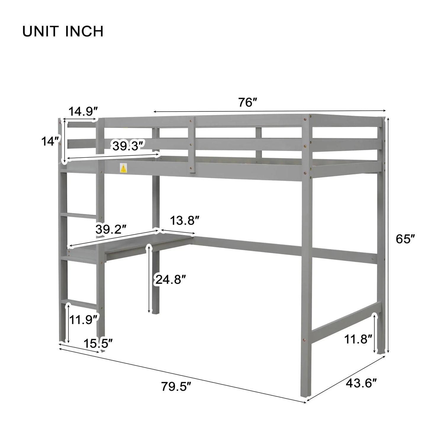 Twin Loft Pine Wood Bed With Built-In Desk, Safety Guardrails, Ladder - Gray
