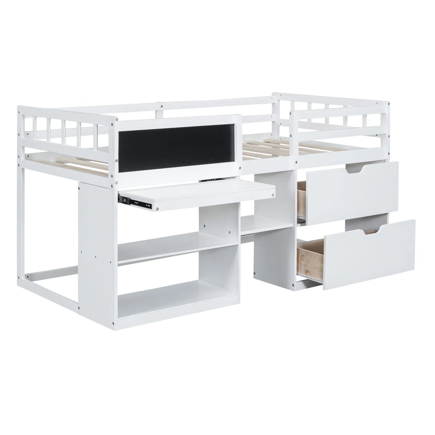 Low Loft Bed With Rolling Desk, Shelf And Drawers