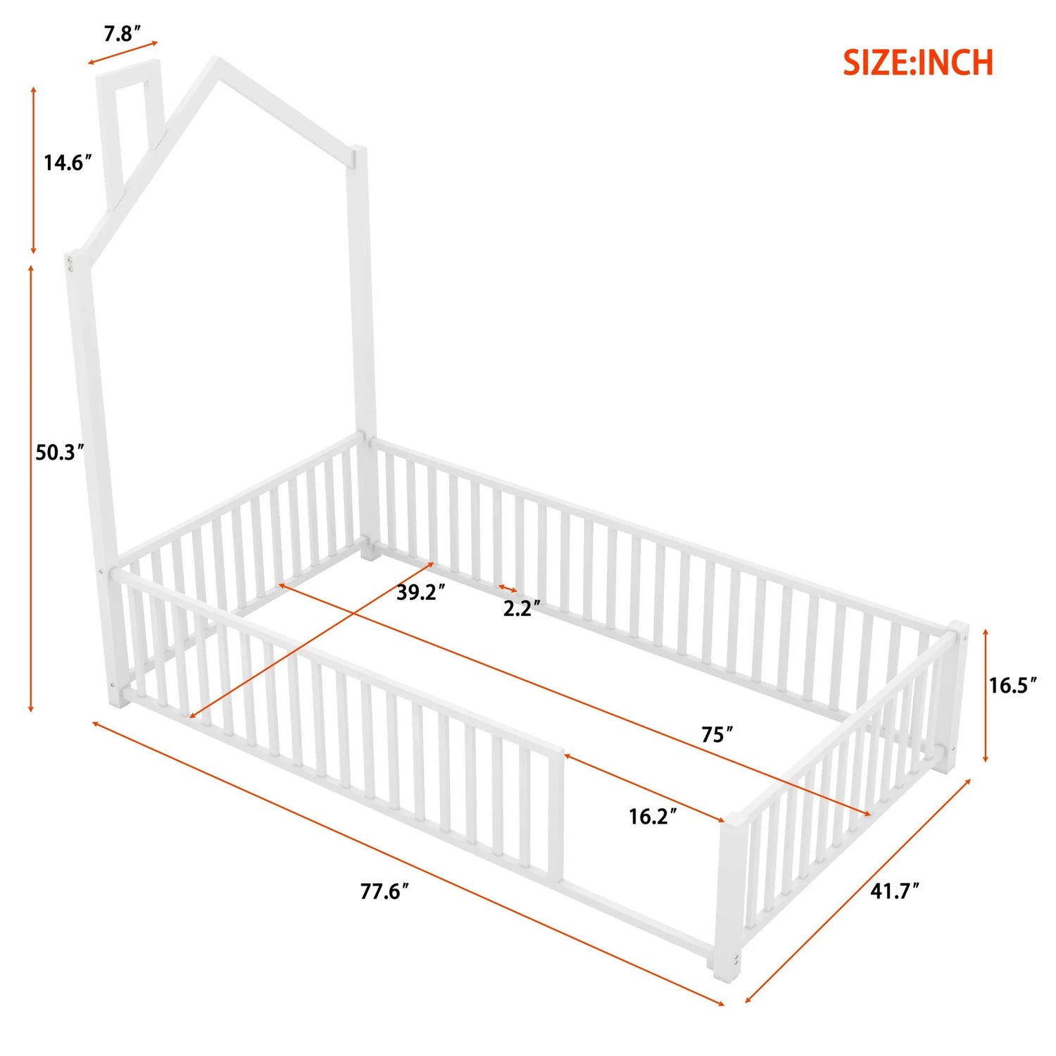 Materials: Solid metal frame with a smooth white finish (as pictured). The frame presents a house-shaped head/roof outline with a chimney detail and surrounding picket-style guardrails.