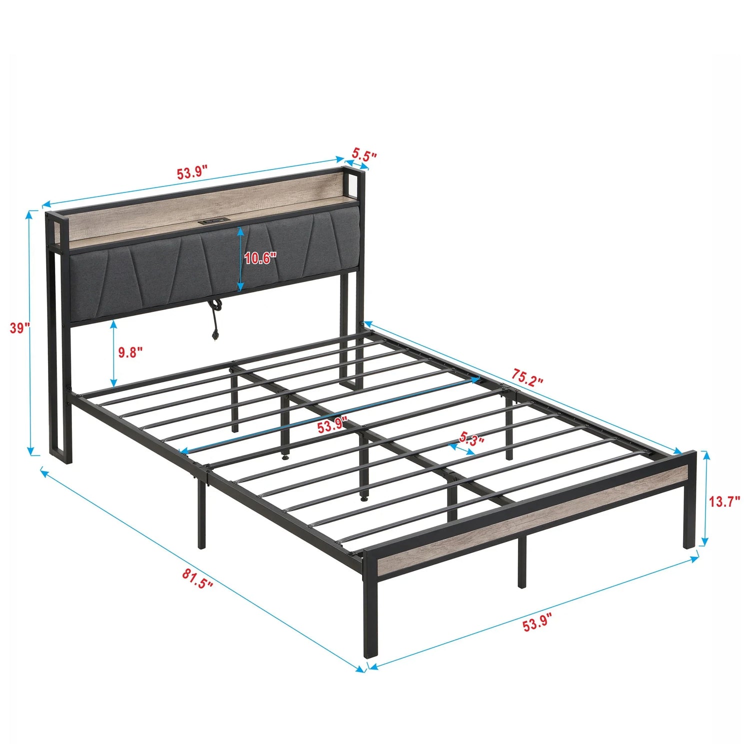 Modern Platform Bed Frame With Upholstered Storage Headboard, USB Ports