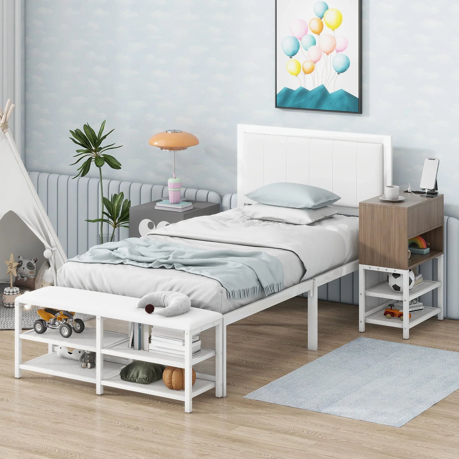 Designed for kids and teens (and any small‑space bedroom that needs smarter storage), this Platform Bed blends industrial metal framing with soft, upholstered comfort and built‑in shelving so the whole room feels neater and more intentional. The low-profile platform supports a standard mattress without a box spring and the padded headboard adds cozy back support for reading or homework.