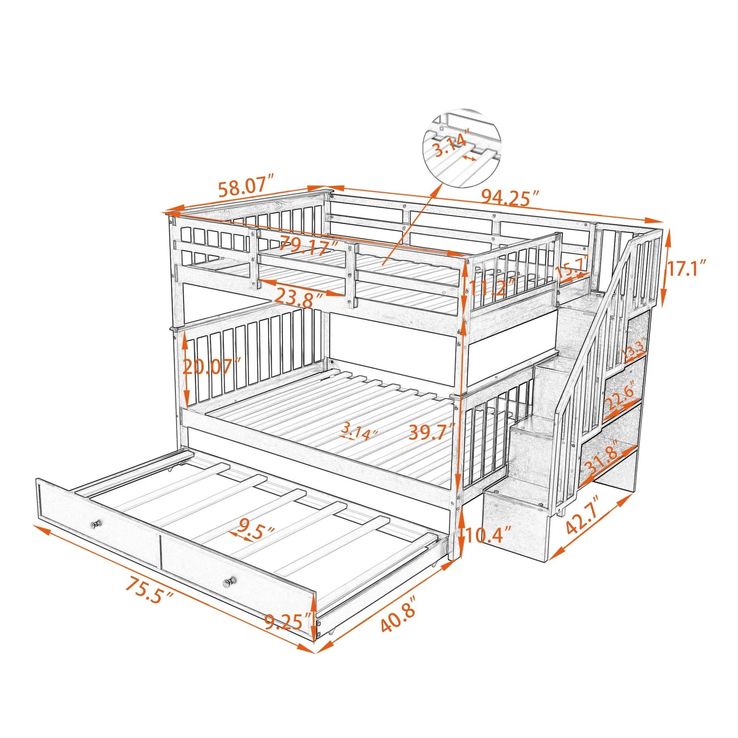 Twin Over Full Bunk Bed Stairway With Storage And Guard Rail For Bedroom - Gray