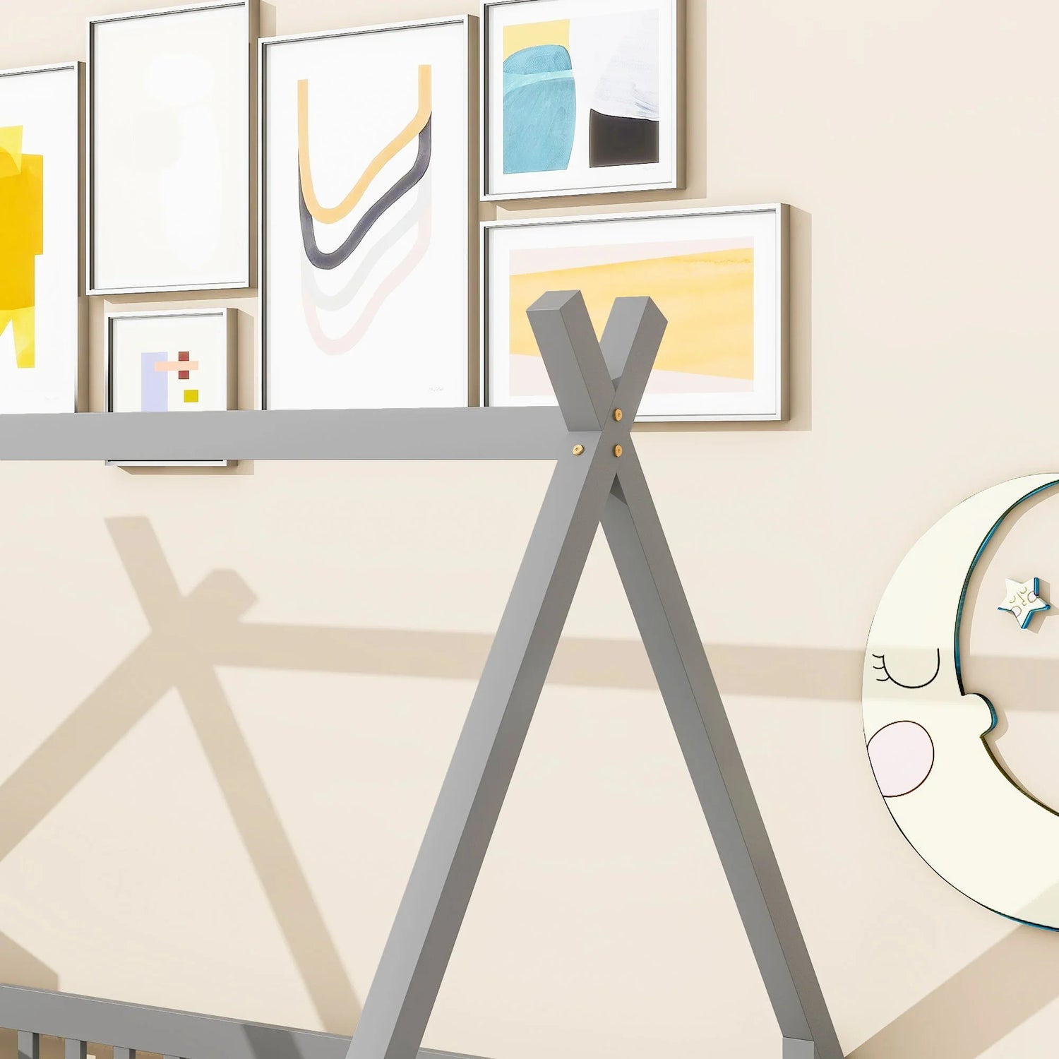 Soften the frame with layered textiles—a fitted low-profile mattress, a removable cotton coverlet, and a string of soft LED lights draped along the peak for a cozy, storybook feel. Pair with a low bookshelf or toy chest for a coordinated, child-friendly zone that keeps essentials within reach.