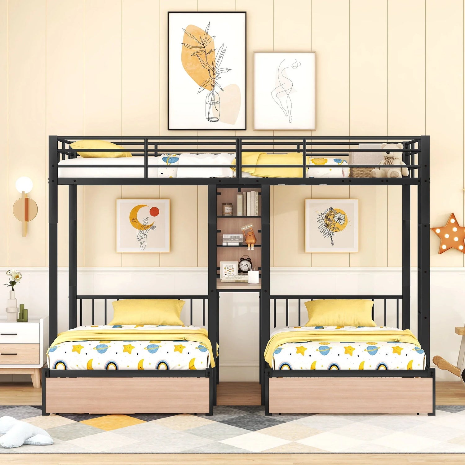 Triple Bunk Bed With Drawers, Multi-Functional Frame With Desks And Shelves In The Middle