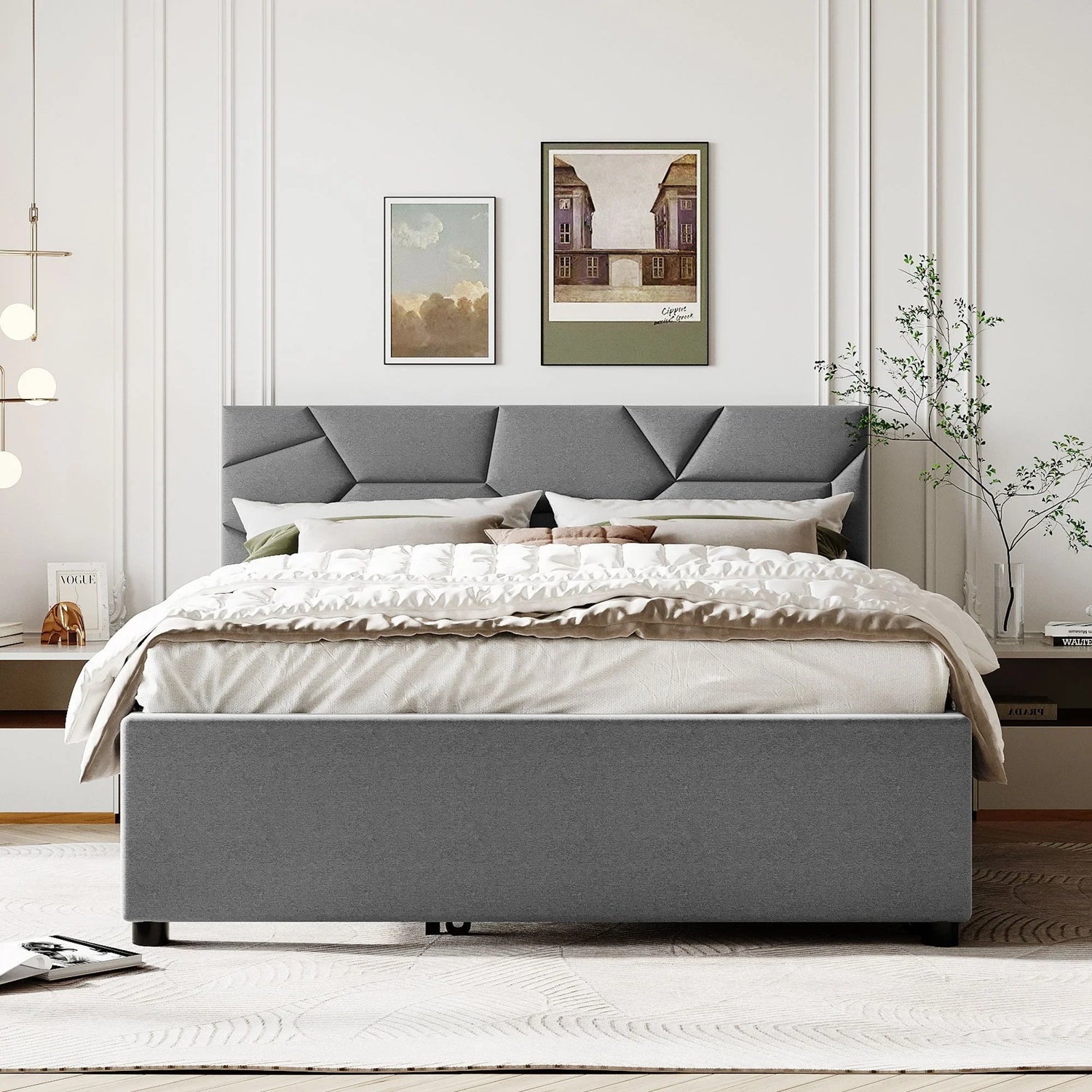 Queen Size Upholstered Platform Bed With Brick Pattern Headboard, With Twin Long Size Trundle And 2 Drawers - Gray