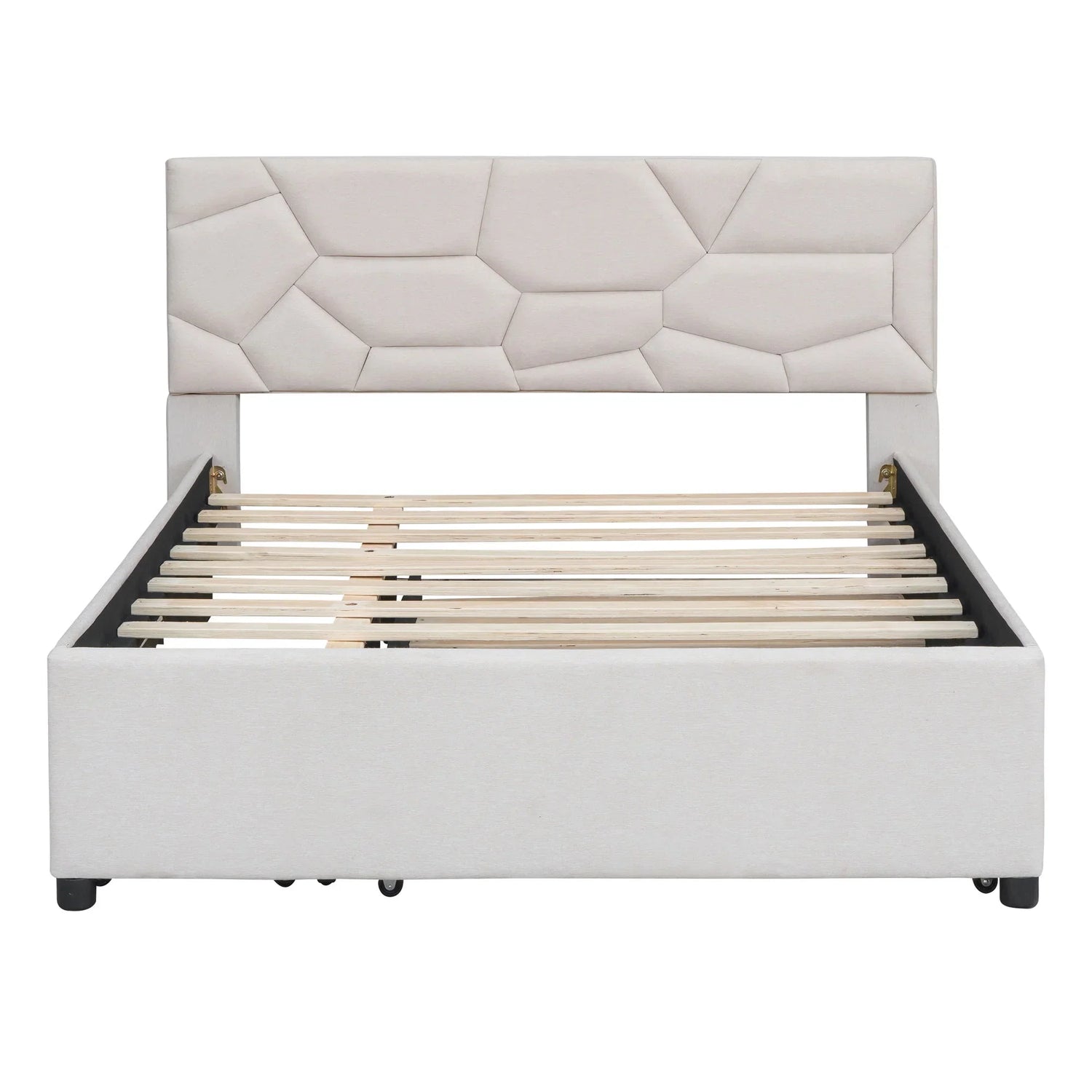 Queen Size Upholstered Platform Bed With Brick Pattern Headboard, With Twin Long Size Trundle And 2 Drawers - Beige
