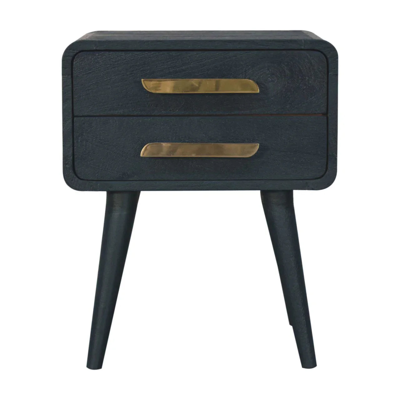 - Artisan Furniture Solid Wood Midnight Teal Bedside Table 2 drawer - Meet the Midnight Teal Bedside Table and transform your space with the perfect blend of style and functionality. Crafted from 100% solid mango wood, its bold teal finish and curved design make it an instant showstopper in any bedroom. It features 2 spacious drawers with elegant brass handles on each drawer, and nordic-style legs