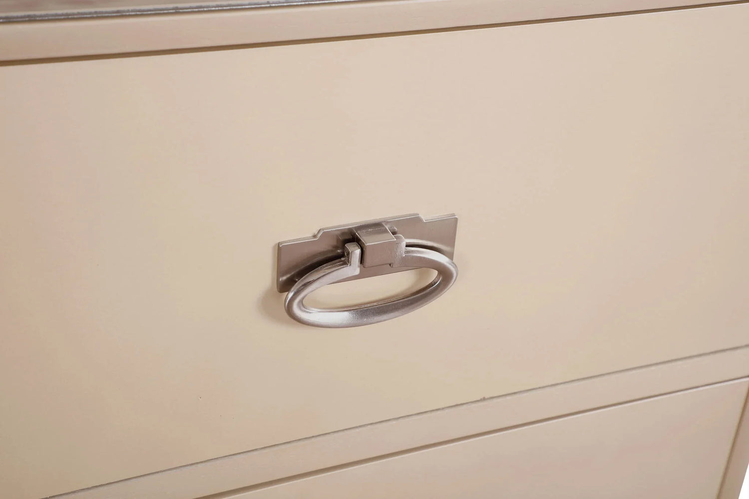 Finish & color: Lustrous silver/champagne appearance with mirrored accents and a subtle textured sheen on the drawer faces. Note: natural materials, lighting and screen settings may produce slight variation in tone and reflected highlights.