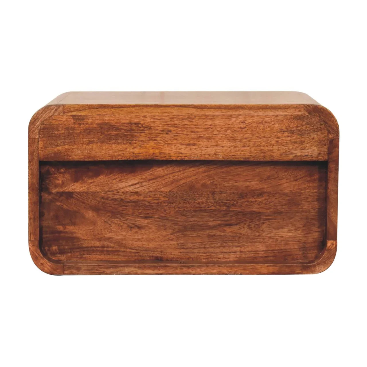 - Curve Upper Slot Floating Bedside - The bigger brother to our original Floating Curve Open Slot Bedside, this minimalistic wall-mounted unit has been constructed from 100% solid mango wood in a finish and features 1 drawer with a shiny knob along with 1 open shelf for storing any bits and pieces you wish to keep close by before bedtime. It's neat and clean design can easily be mounted on the wall without the fuss of any legs. Caution! Do not sit on the unit.