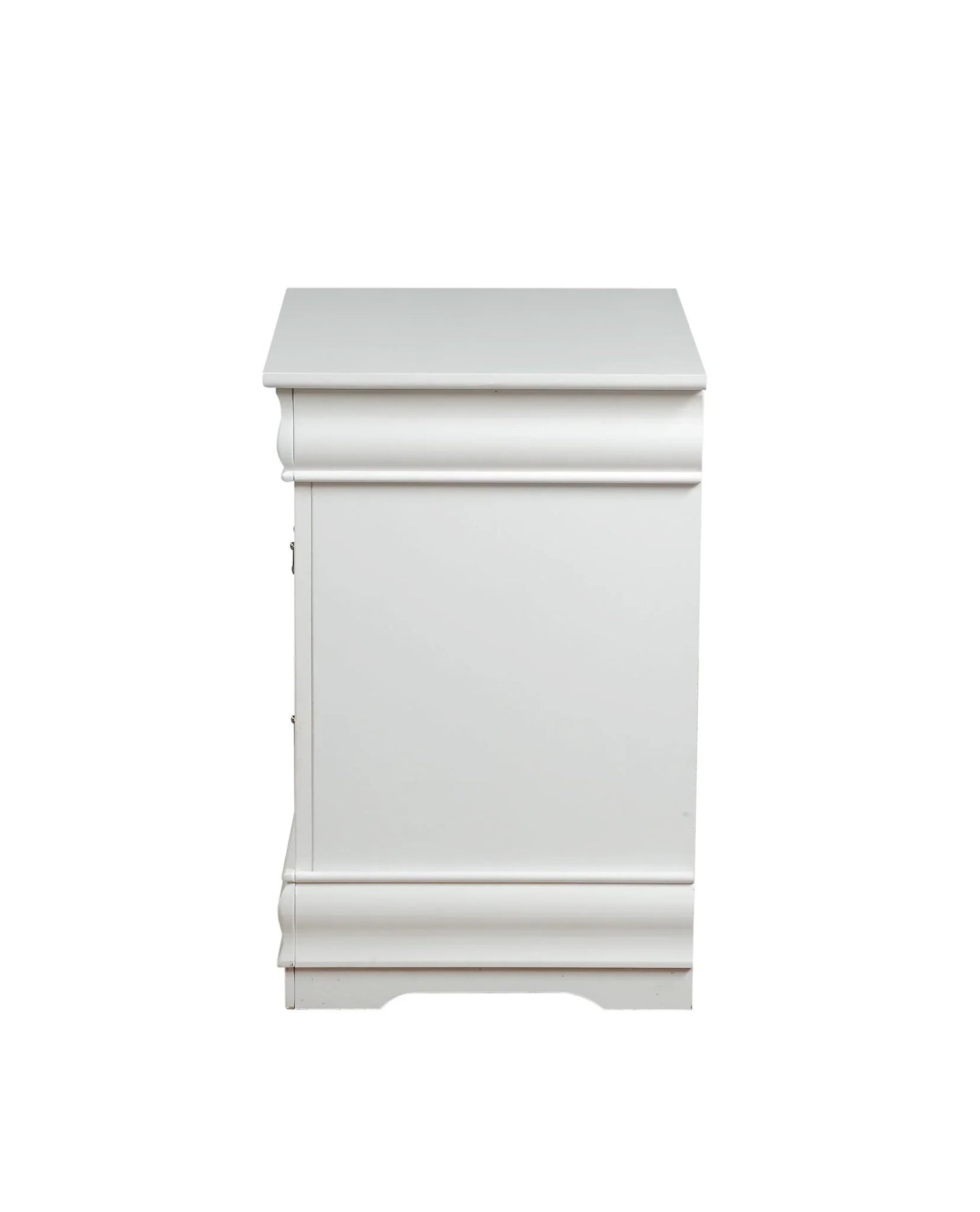The Louis Philippe Accent Nightstand brings classic form to a modern bedroom. Designed for someone who wants a refined bedside presence without fuss, it pairs sculpted crown molding and a shaped plinth base with a compact footprint — ideal next to a bed in master suites, guest rooms, or stylish apartments. Two roomy drawers keep nightly essentials and bedside clutter out of sight while polished metal bail pulls add a subtle, upscale contrast.