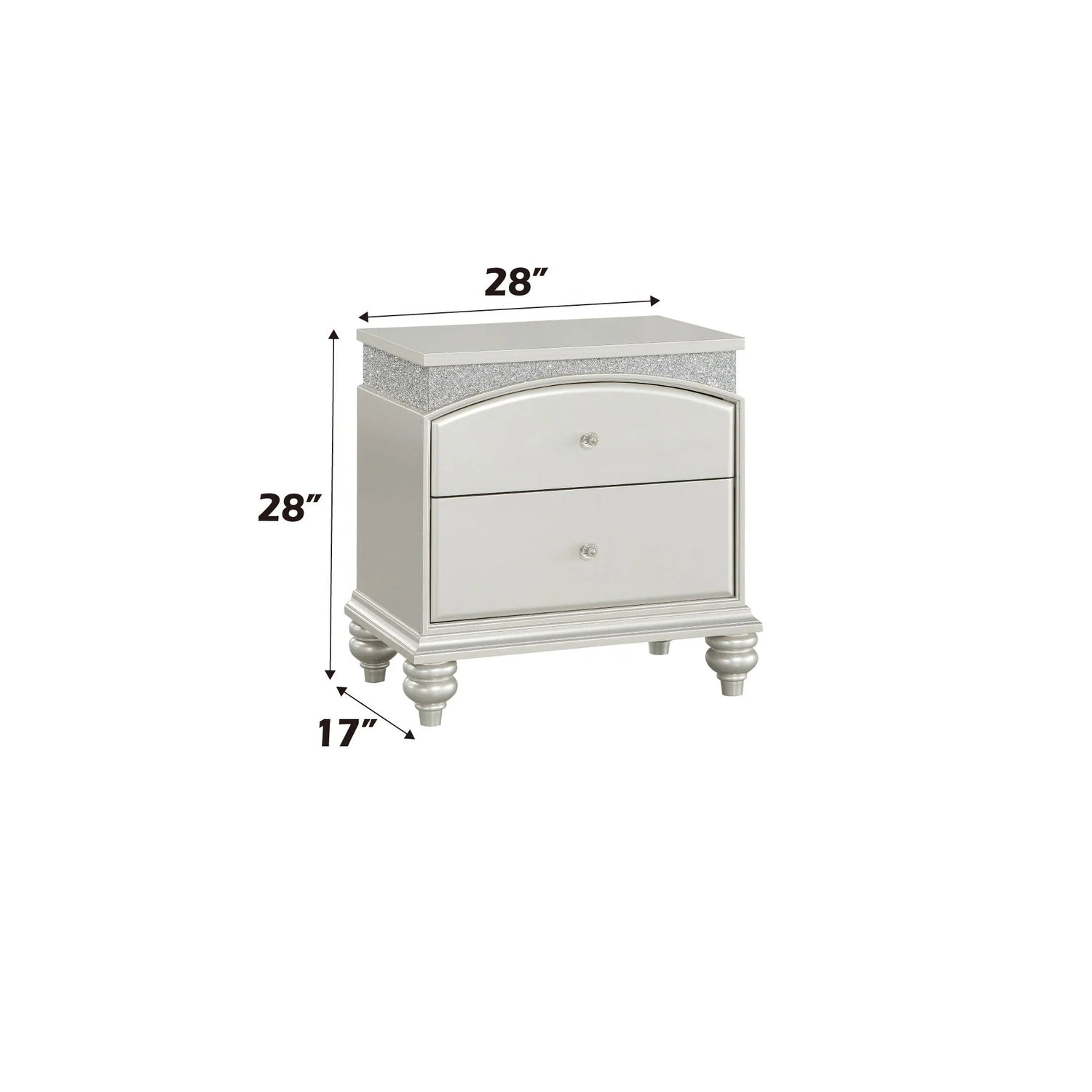 The Maverick night stand in a pearl silver (platinum) finish is for anyone who wants a glamorous yet practical bedside piece that reads modern-traditional. It fits equally well beside a tufted bed or a sleeker upholstered frame, offering two roomy drawers for nightly essentials and a tabletop surface for a lamp, book, or a small tray.