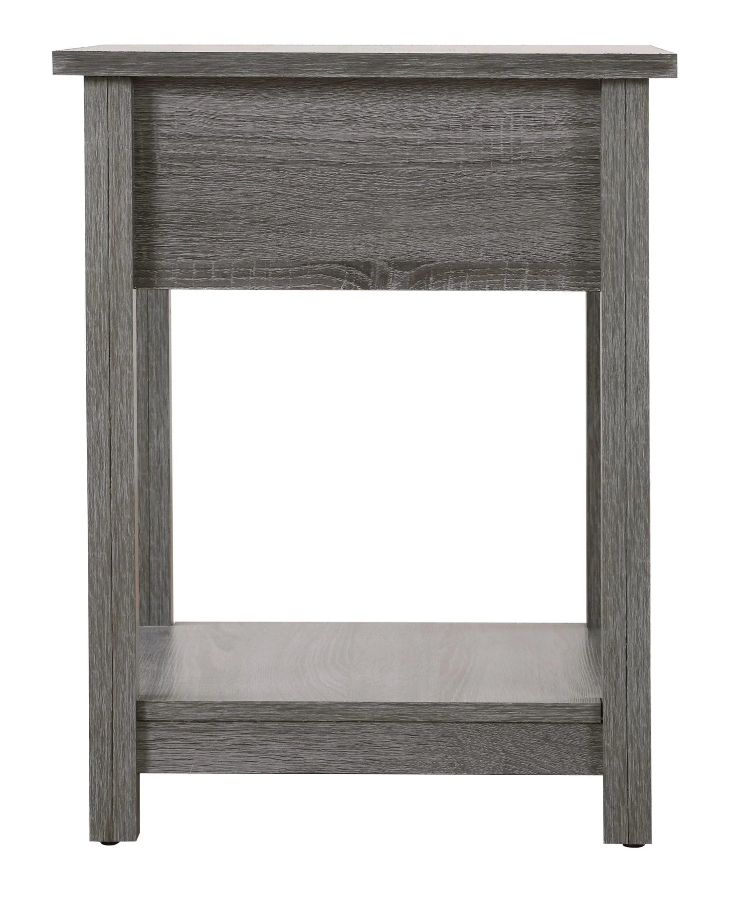 Compact and practical, the Salem nightstand is designed for the bedside of someone who wants clean-lined, modern storage without bulk. Its single smooth‑glide drawer and open lower shelf keep nightly essentials within reach — ideal for small master bedrooms, guest rooms, or apartments where a compact footprint matters. The grey laminated finish in the product photos reads as a cool, weathered wood tone with subtle grain for a contemporary, lived‑in look that pairs easily with neutral or warm bedding.