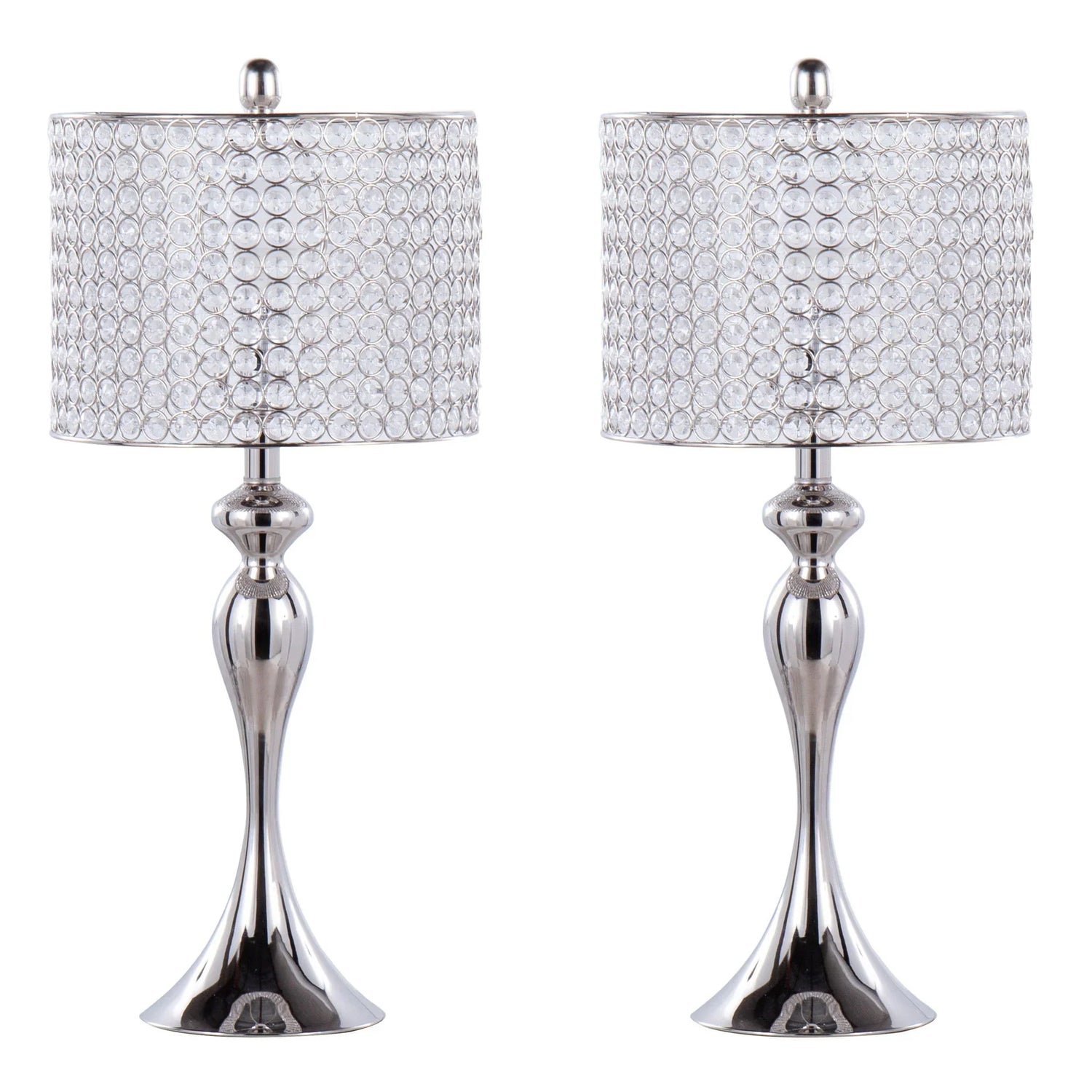 Perfect for anyone who wants a touch of contemporary-glam in a living room, bedroom, or entryway, the Ashland Table Lamp (set of 2) brings sculptural form and sparkling detail to bedside tables, console surfaces, or flanking a sofa. The slender, hourglass metal base in a polished nickel finish reads modern and refined, while the round drum shade wrapped in clear crystal beads adds reflected light and jewelry-like sparkle—ideal for interiors that mix clean lines with a little glamour.