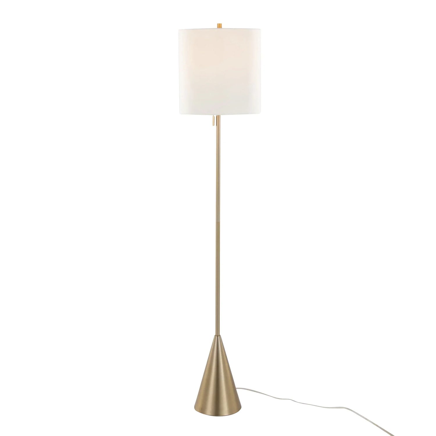 Designed with clean lines and luxe details, this lamp pairs a soft white fabric drum shade with a slender metal stem and a dramatically flared metal cone base finished in a plated gold tone. It’s a straightforward, everyday accent light that lifts modern and contemporary interiors — from warm, layered living rooms to crisp, pared-back home offices.
