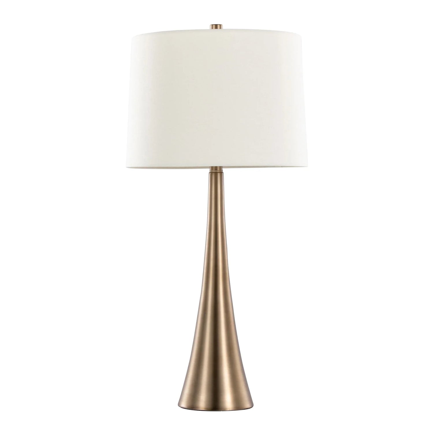 • Finish: Matte golden bronze base with a white/pearl linen empire shade; warm undertones on the metal, low‑sheen matte finish on the base.