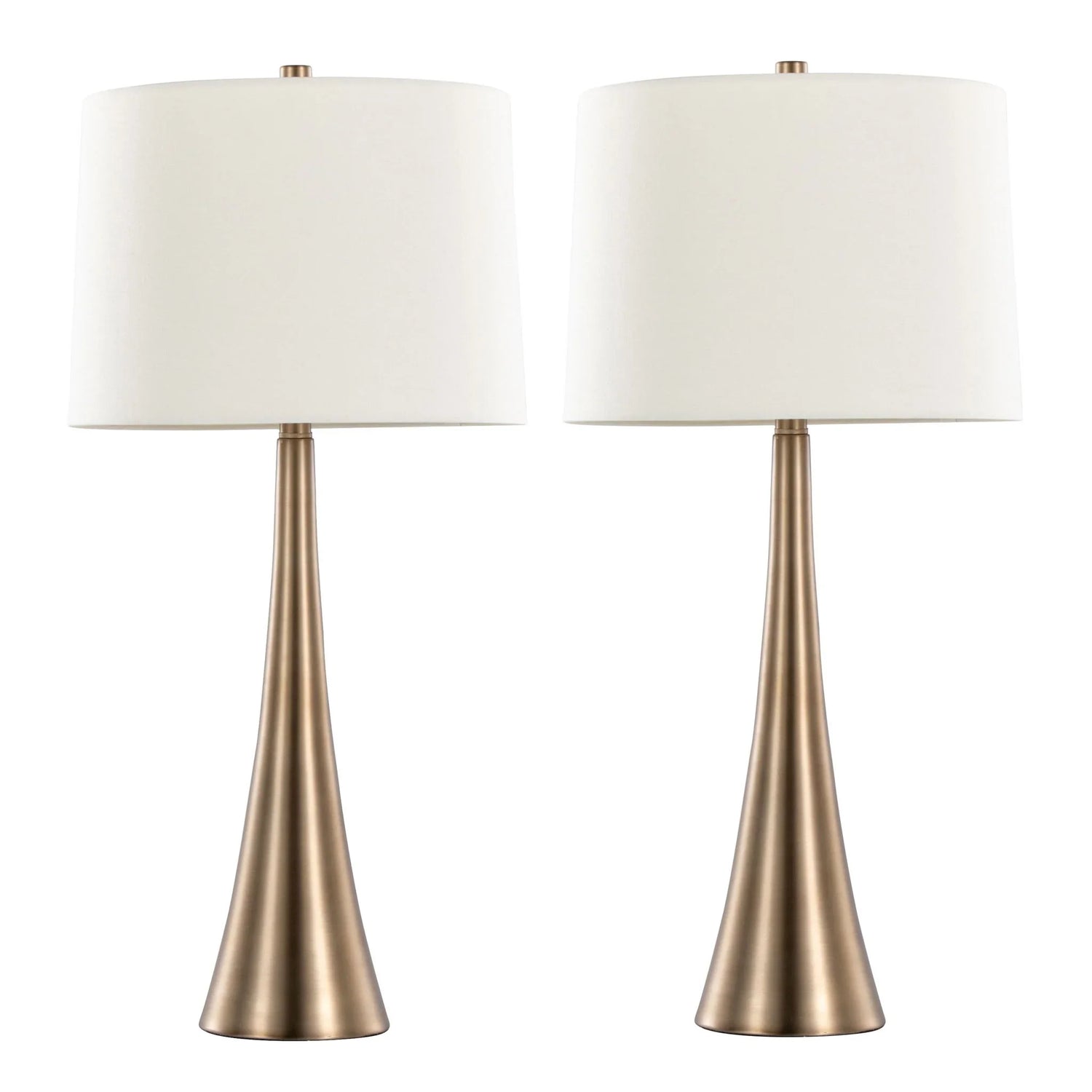 Day-to-day, Diana is a workhorse: the tapered metal base provides stable support while the linen shade softens and diffuses light for reading, relaxing, or creating ambiance. Finished in a matte golden bronze with a white linen shade, the pair reads warm and neutral in most palettes; natural variations in fabric and metal finish mean each piece has subtle, authentic character.