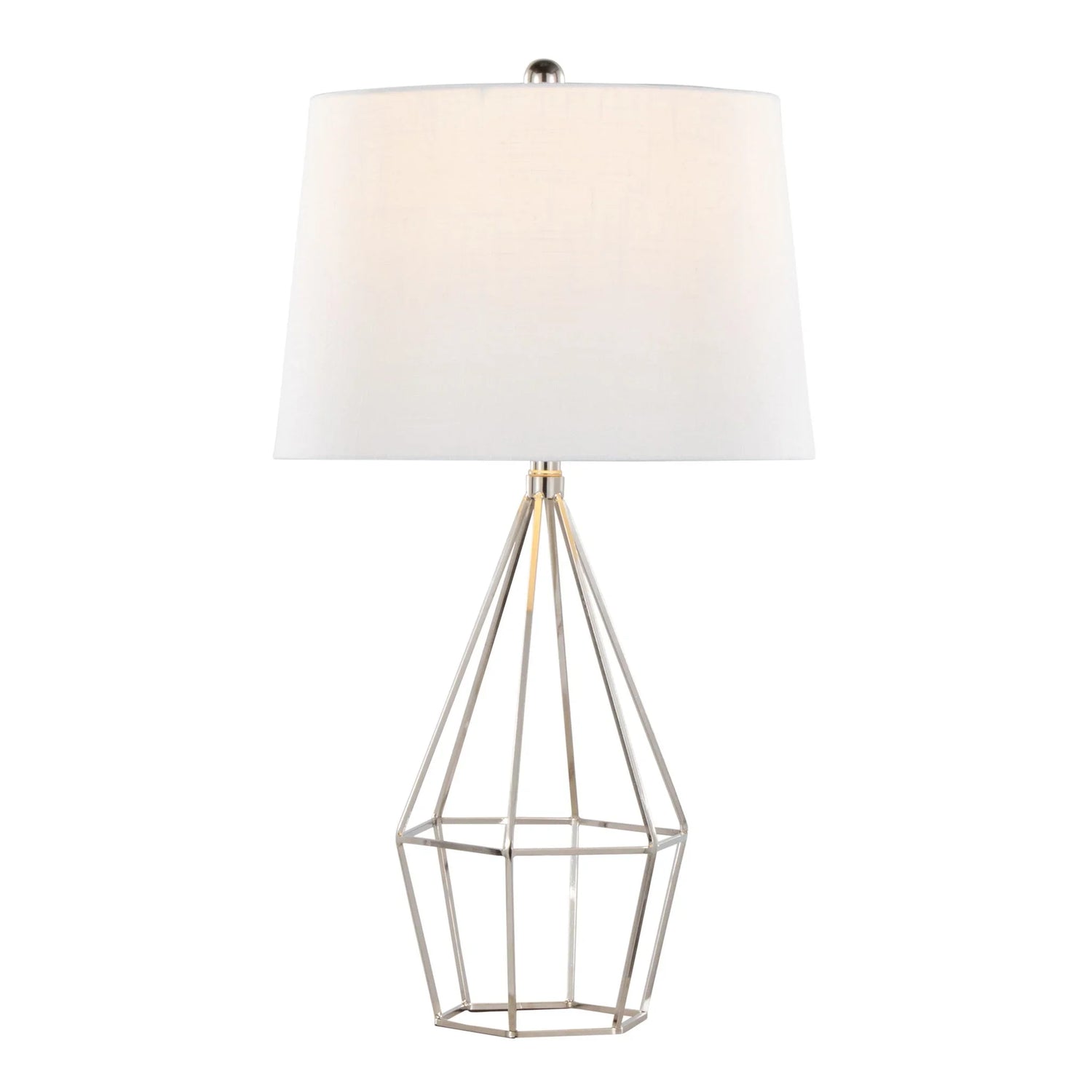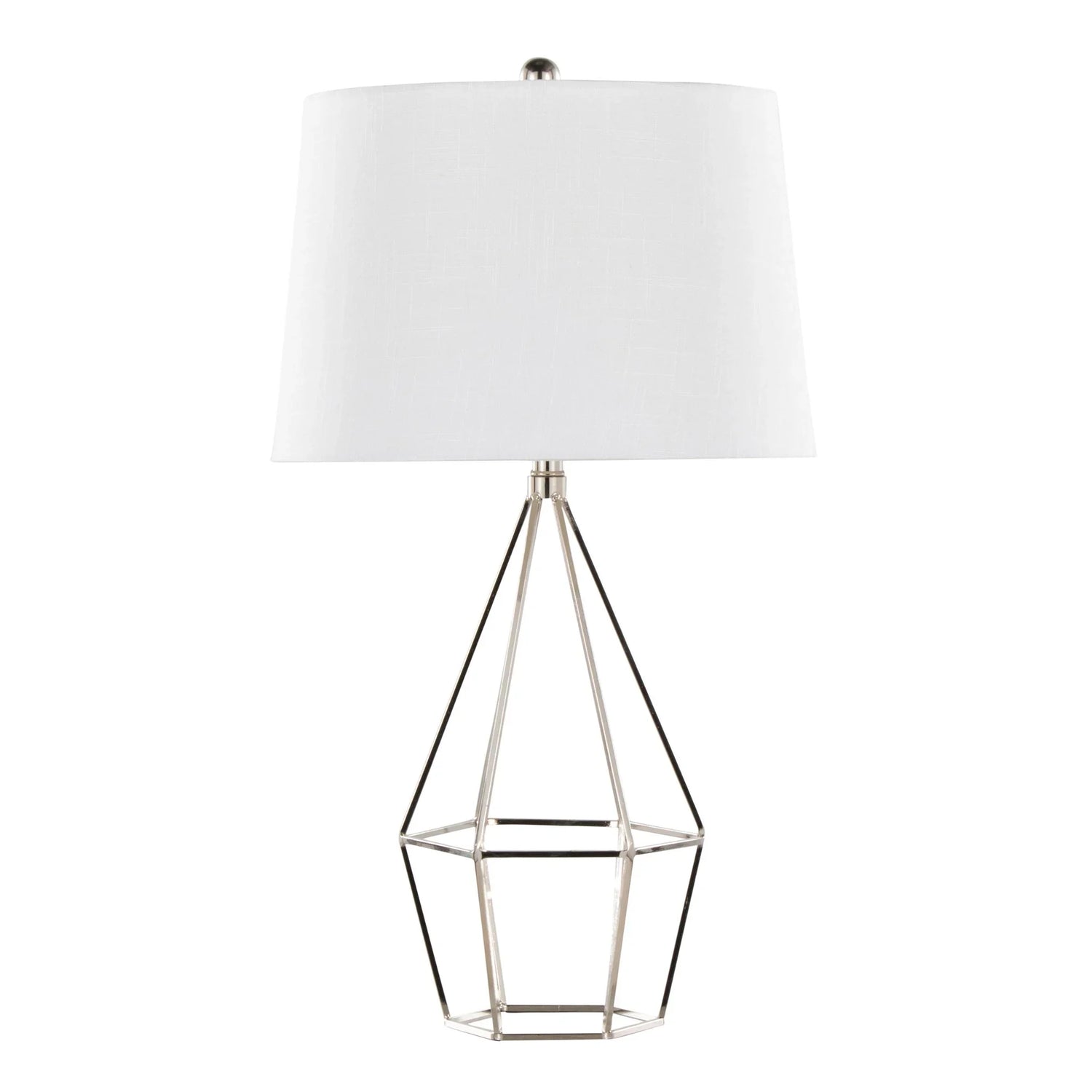 - Materials: Metal base with polished nickel finish; white fabric drum shade.