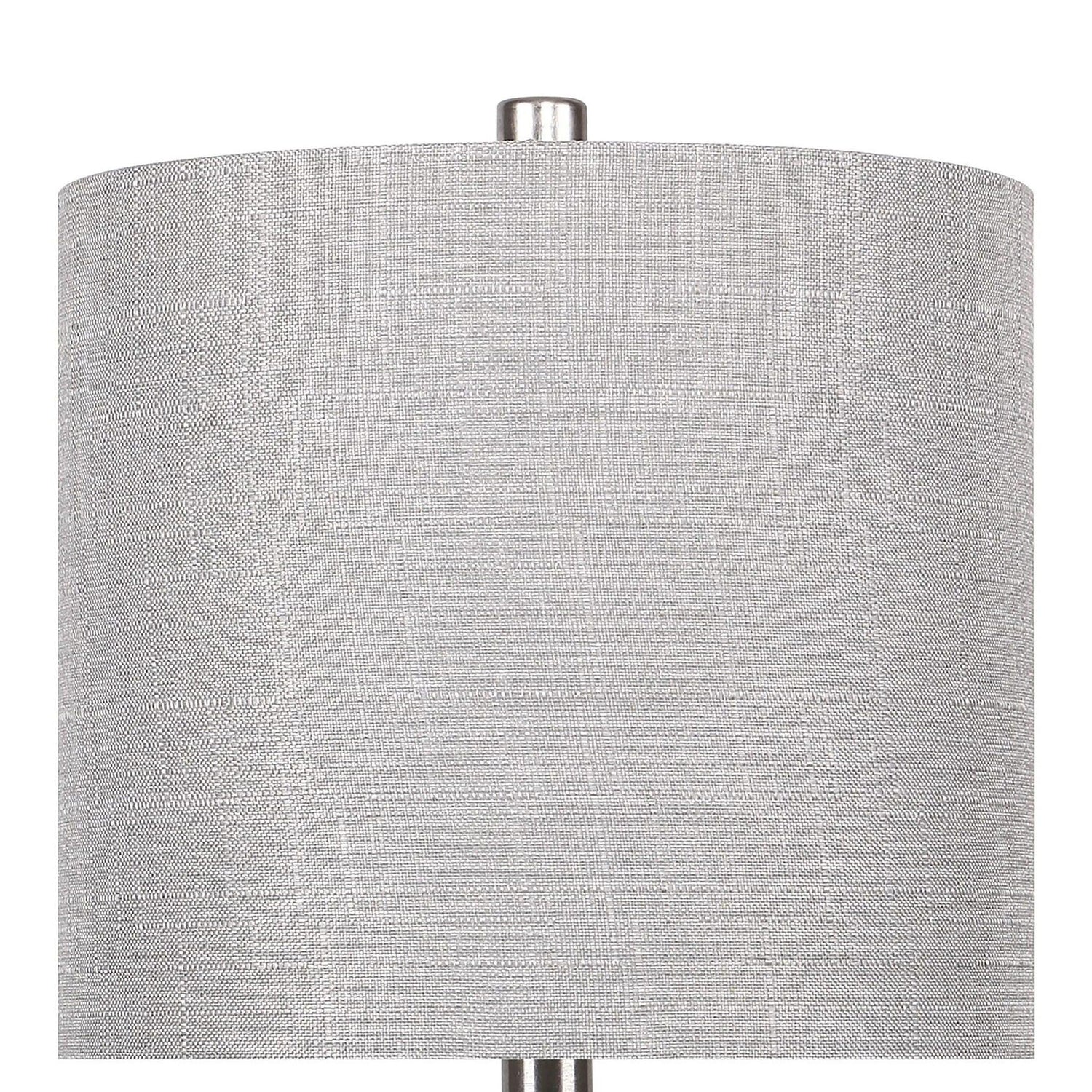 Materials & finish: metal base with brushed nickel–style finish; gray linen drum shade. Natural textile texture and metal sheen may vary slightly from screen images.
