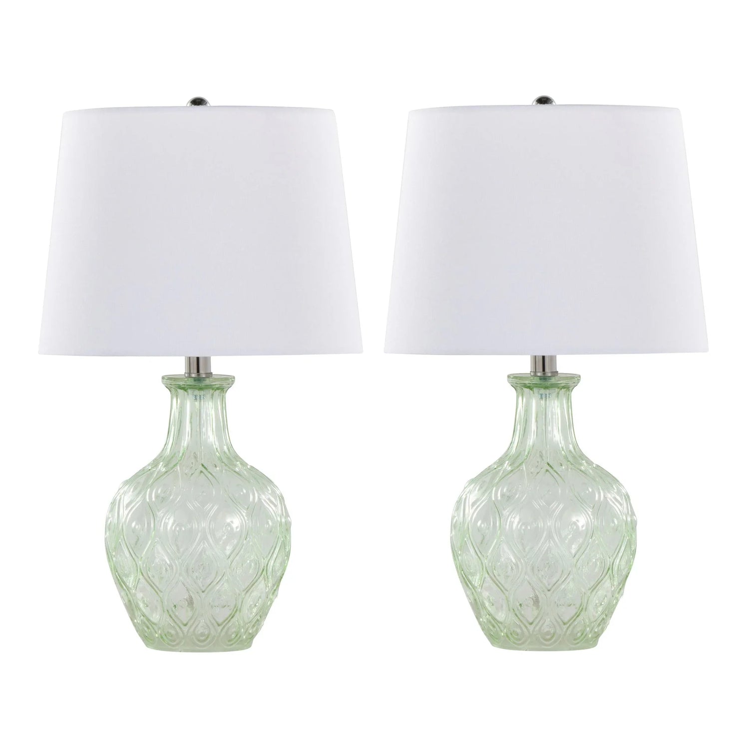 - Construction and Features: The lamps boast a stylish textured glass construction with a linen shade, a rotary switch for easy use, and come as a set of two.
