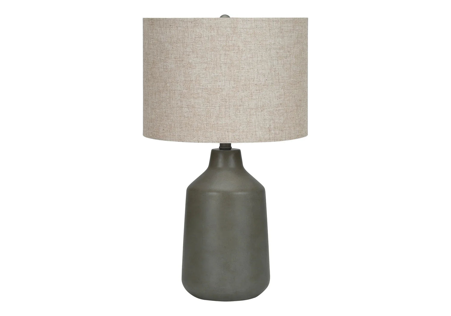 - Materials: Concrete base with a fabric drum shade and metal harp/finial hardware; finish shows subtle matte concrete texture and a neutral woven shade.