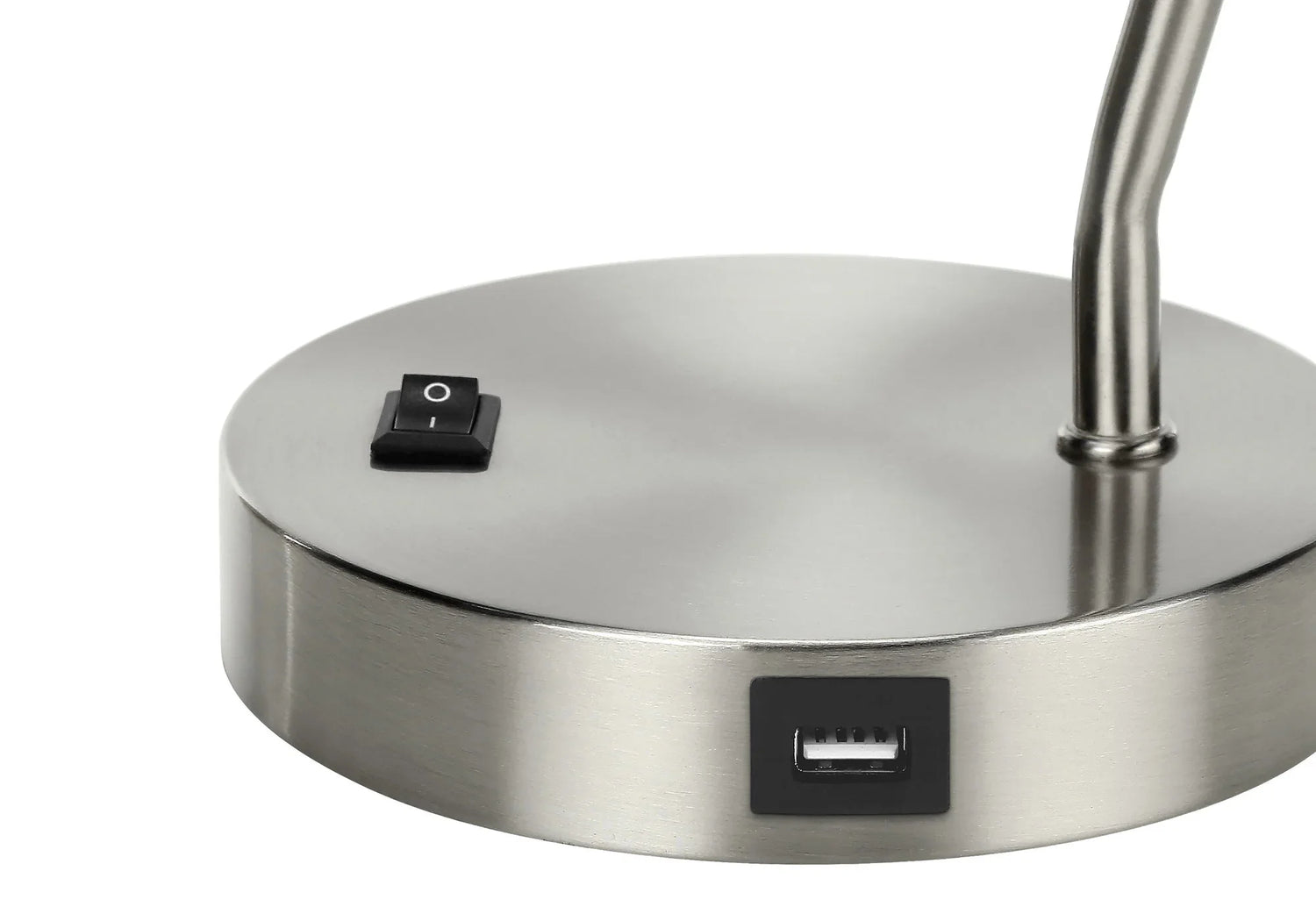 Everyday use is simple: the flexible arm and swivel head let you direct light where you need it, and the built-in USB port in the base keeps a phone or tablet charged without an extra adapter. The brushed nickel finish reads warm-silver on screens; natural metal grains and lighting conditions may produce subtle variation.