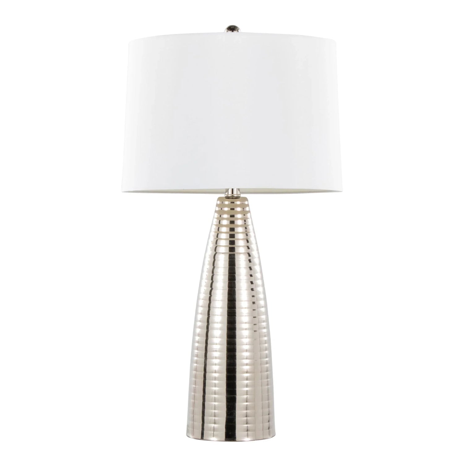 The Maya table lamp set (two lamps) is for anyone looking to add contemporary glamour and warm, layered lighting to living rooms, bedside tables, or entryway consoles. Each lamp pairs a sculptural, ribbed metal base with a soft white linen tapered drum shade—a balance of textural presence and understated brightness that works equally well beside a sofa or flanking a bed.