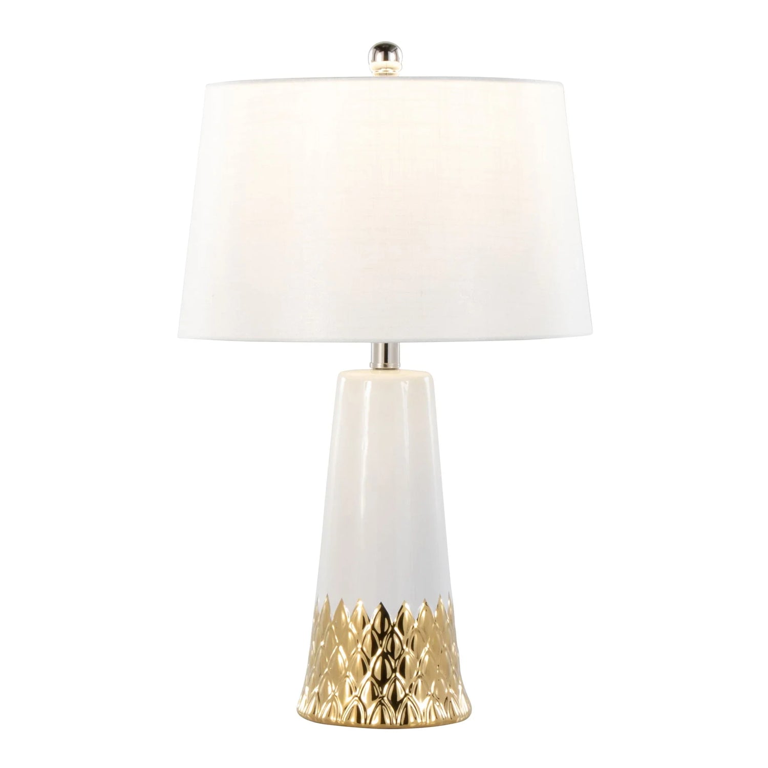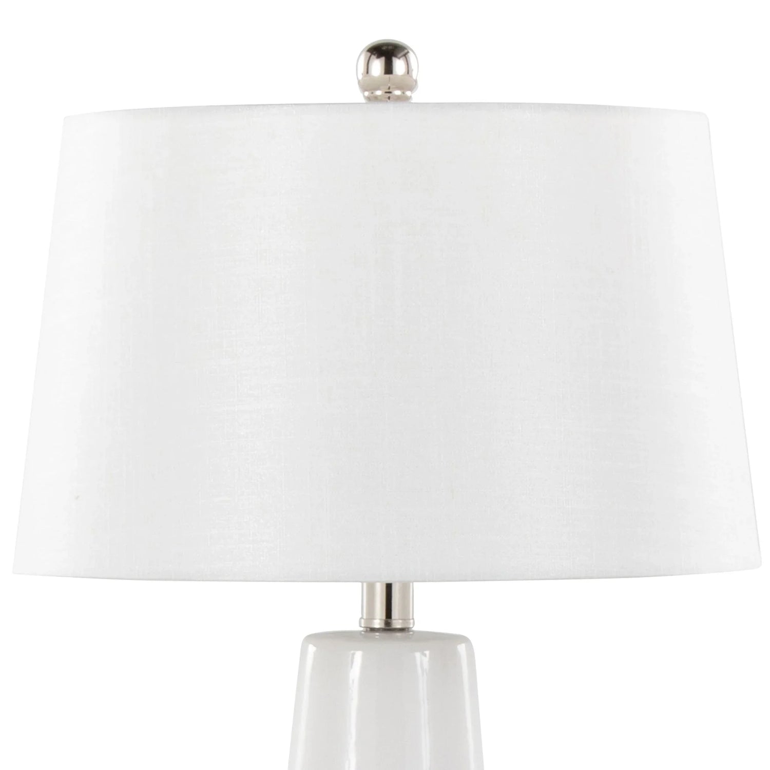Materials: Gloss-glazed ceramic base with polished metal accents and hardware; white fabric lamp shade (as shown).