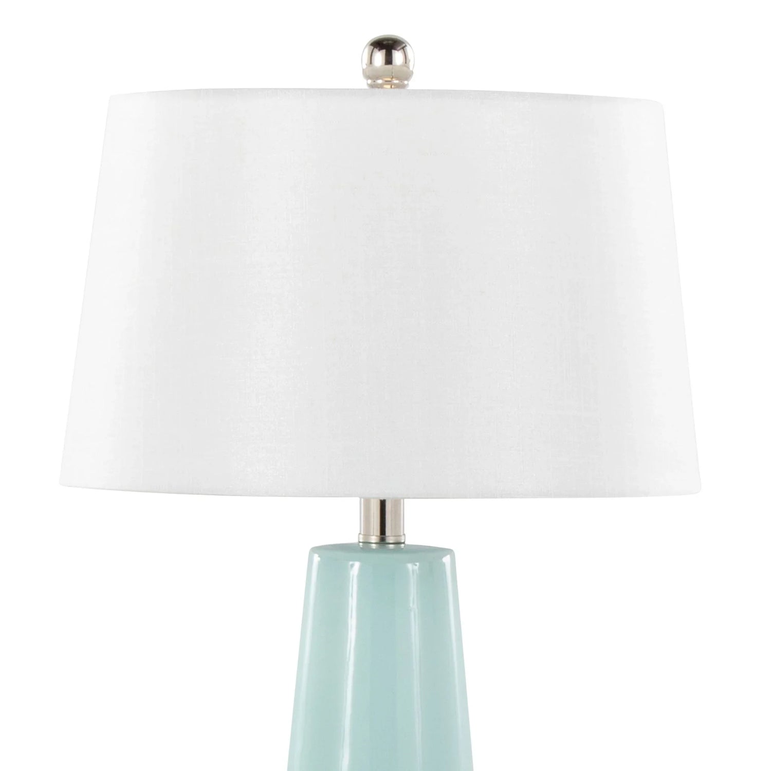 Day-to-day the lamp pairs practical lighting with decorative impact: a crisp white fabric shade delivers even, ambient light while the glossy ceramic base adds a relaxed, coastal-leaning pop of light blue. Polished metal accents at the base and hardware elevate the overall look for modern & contemporary interiors. Assembly is required and the piece ships as a single table lamp body ready to complete with your preferred shade and bulb if needed.