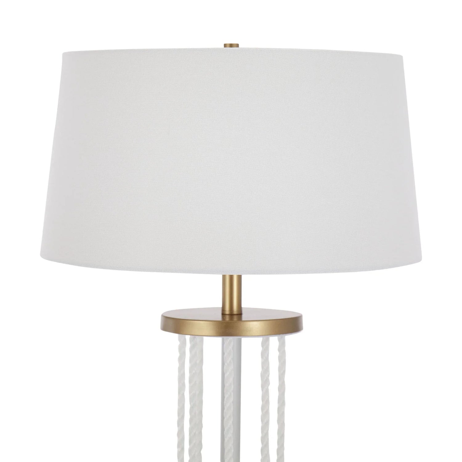 Built around a cluster of vertical, rope-wrapped columns with warm gold metal and white wood accents, this lamp pairs sculptural detail with everyday practicality. The classic white drum shade softens the glow and keeps the silhouette clean, while the slim round base keeps the footprint easy to place. Assembly is required and the lamp is sold individually.