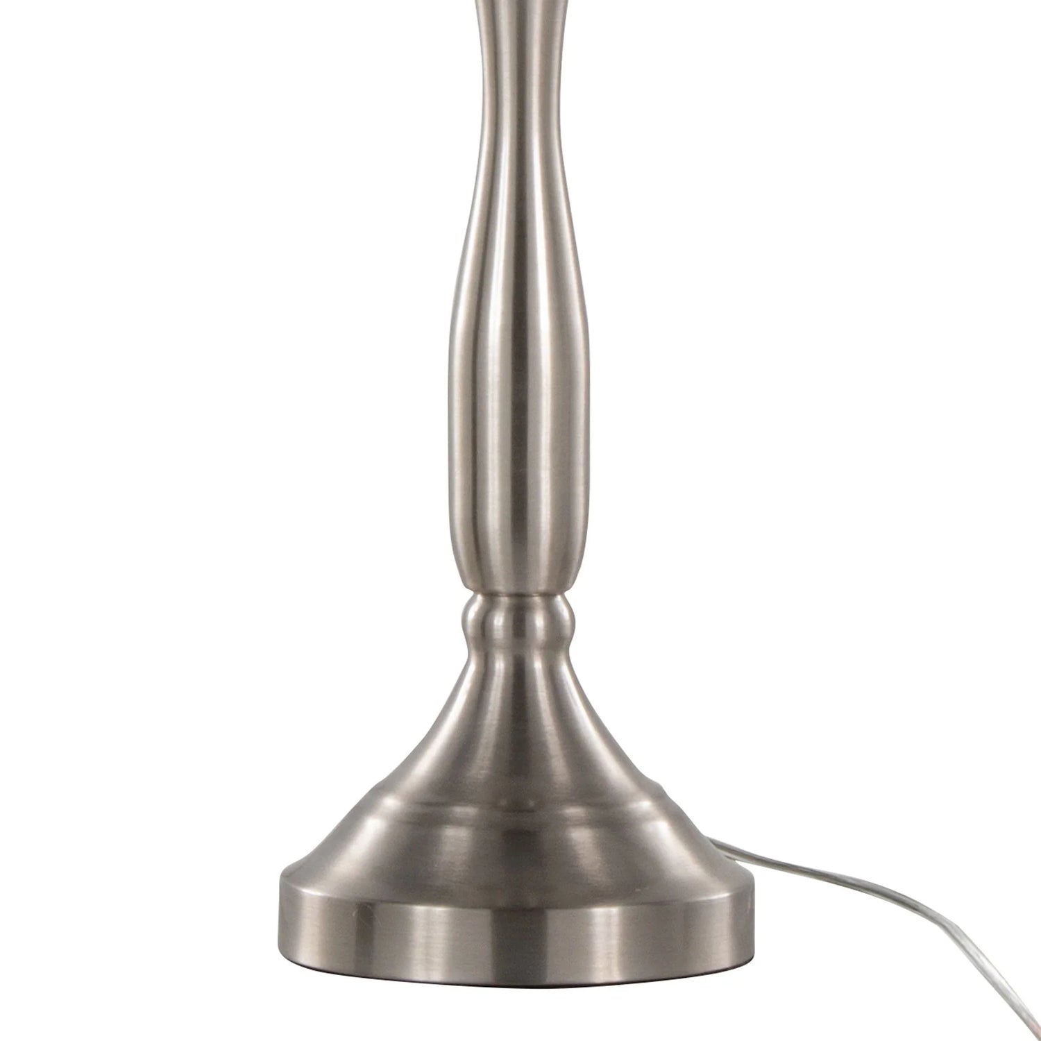 - Materials: Metal base with satin nickel finish; white fabric drum shade.