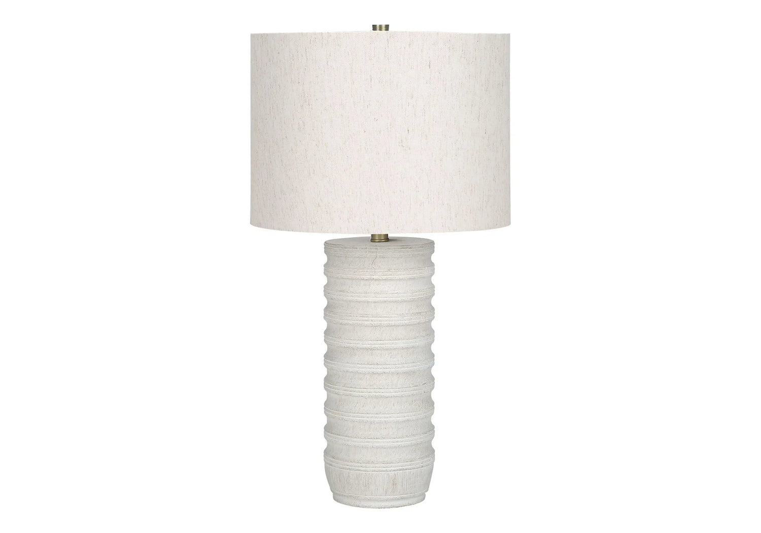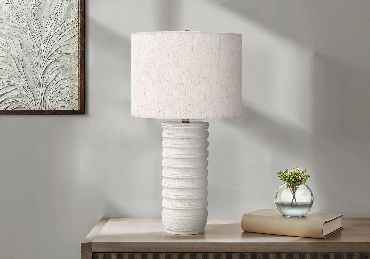 Clean, calm, and quietly sculptural — this transitional table lamp is designed for people who want soft, layered light and simple form on a nightstand, console, or side table. The 28" (71.1 cm) cylinder silhouette and ridged resin base bring tactile interest to living rooms, bedrooms, and entryways while the ivory linen drum shade keeps illumination warm and diffused.