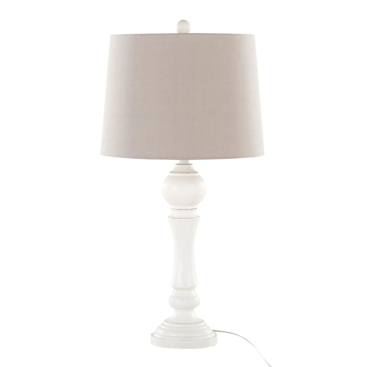 - Materials: Polyresin body with distressed faux‑wood finish; woven linen empire shade; plastic cord covering and standard hardware.